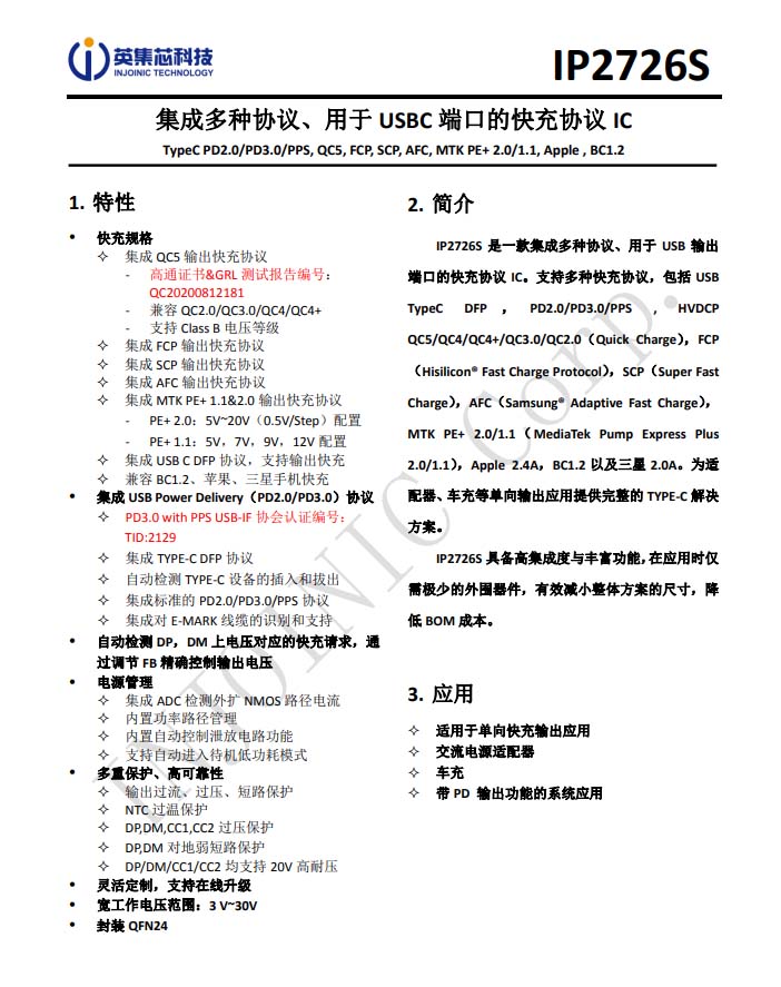 IP2726S是一顆集成多種協(xié)議、用于USB輸出端口的快充IC,支持Type-C DFP、PD2.0/3.0、PPS、QC5、QC4/4+、QC2.0/3.0、FCP、AFC、SCP、MTK PE+、Apple2.4A、BC1.2以及三星2A等協(xié)議。具有高集成度和豐富的功能,在應(yīng)用時(shí)僅需極少的外圍器件,有效減小整體方案的尺寸,降低BOM成本。