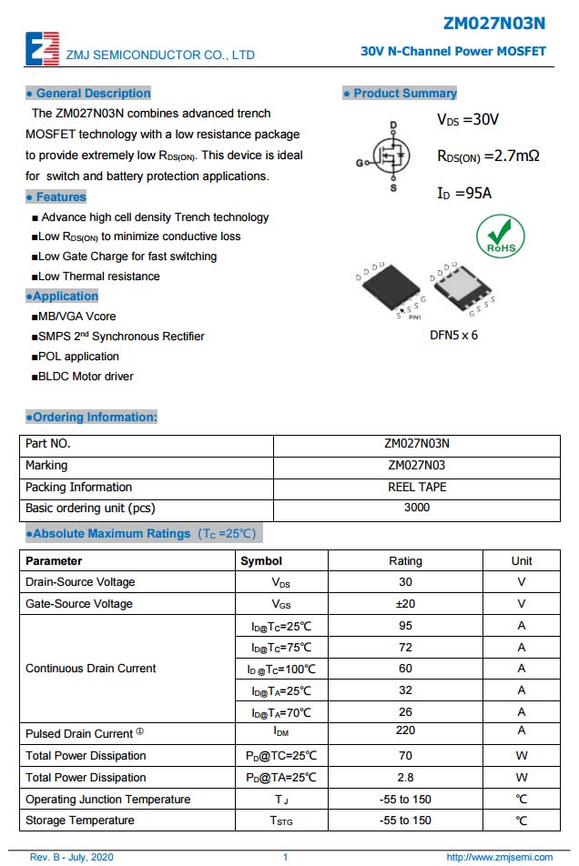 輸出VBUS開(kāi)關(guān)管采用真茂佳ZM027N03N,耐壓30V,導(dǎo)阻2.7mΩ,DFN5x6封裝。