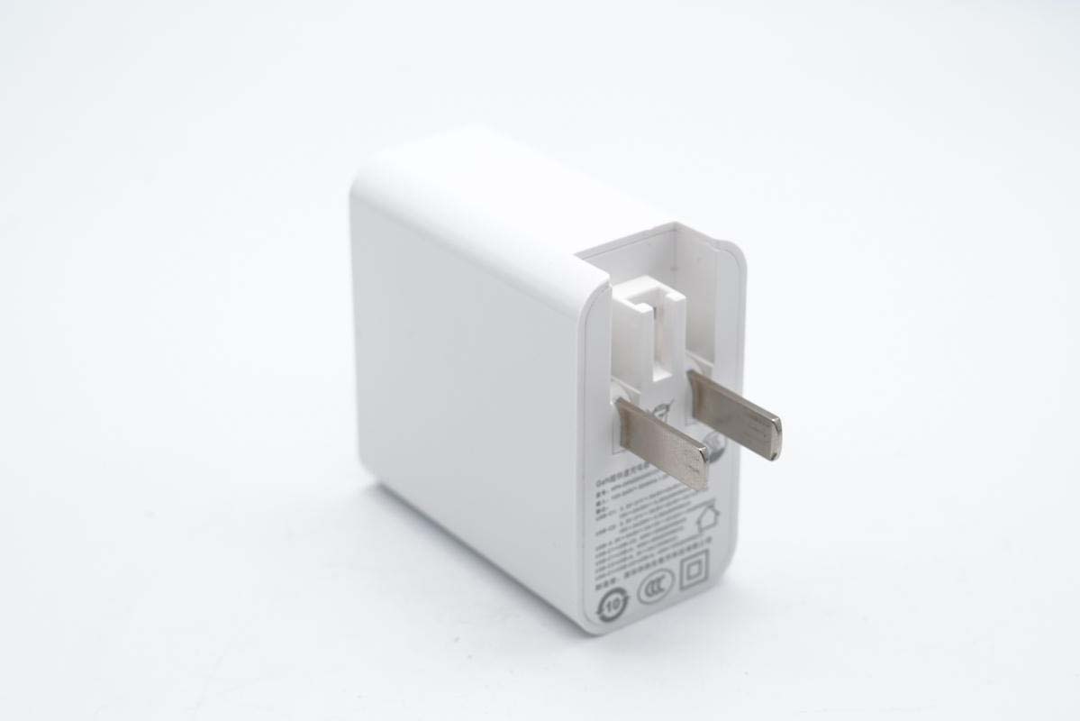 華科生65W氮化鎵快充采用PC阻燃材質白色外殼,腰身高光亮面處理,各面間過渡圓潤,十分光滑簡潔,使用手感好。