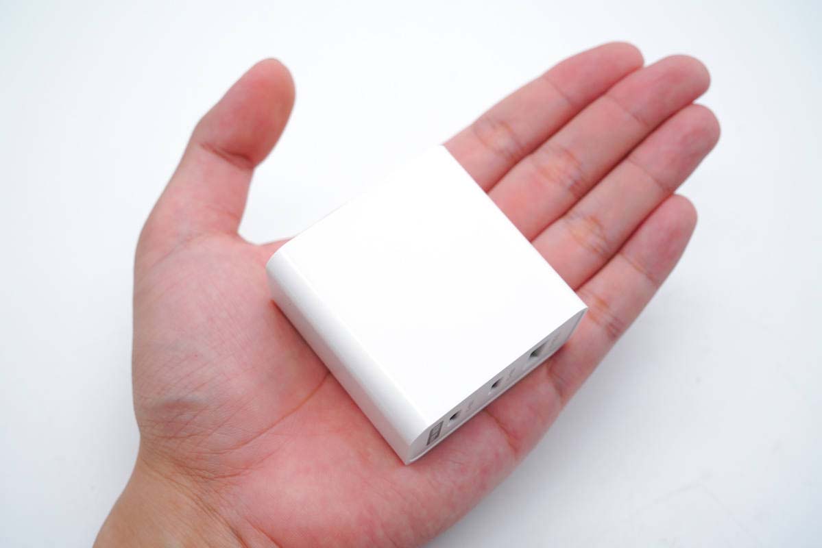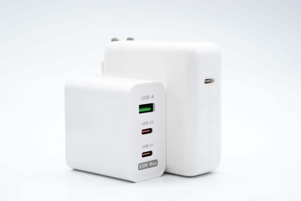 和蘋果61W充電器直觀對比,體積優勢明顯。