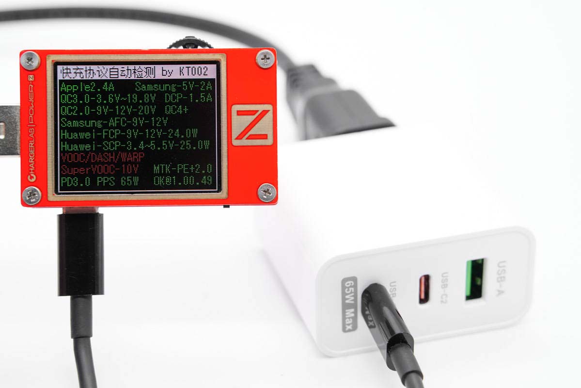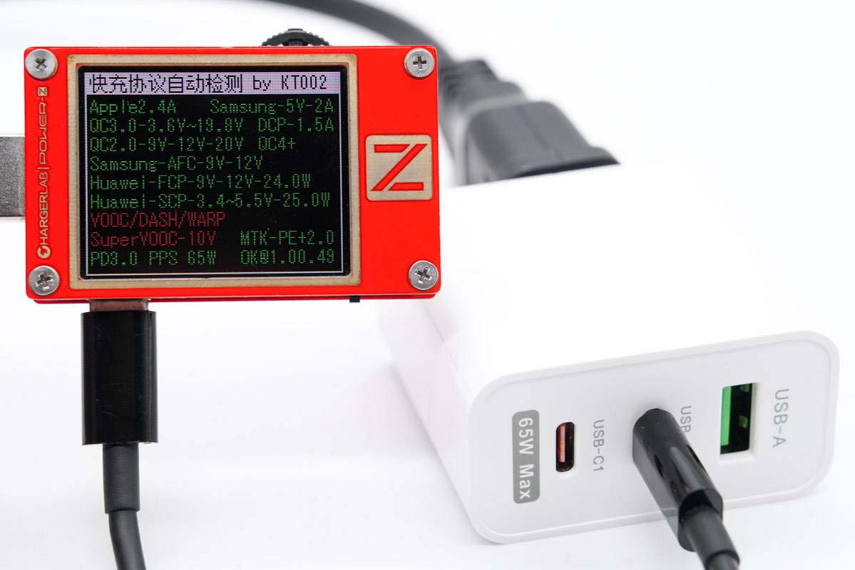 使用ChargerLAB POWER-Z KT002檢測USB-C1口輸出協議,顯示支持Apple 2.4A、Samsung 5V2A、DCP協議,以及QC2.0/3.0、AFC、FCP、SCP、PE2.0、PD3.0、PPS多個快充協議。