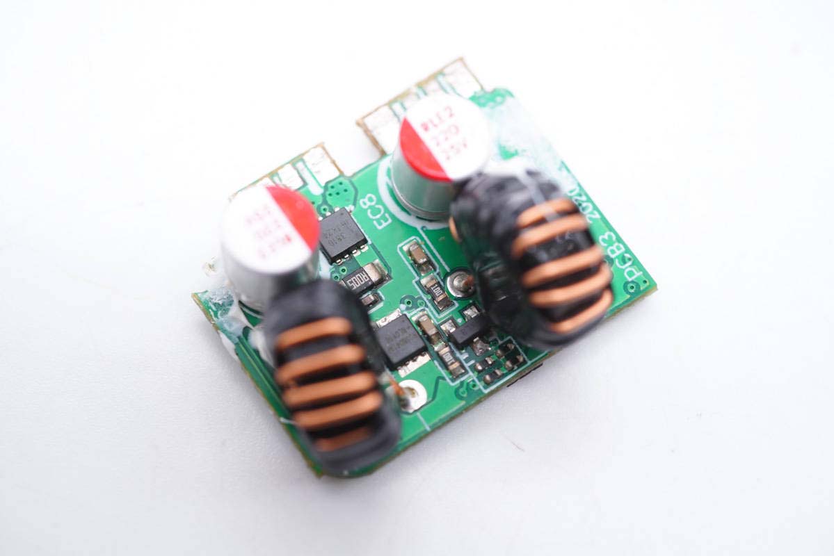 小板上設有兩路二次降壓電路,正面設有一對降壓電感以及一對輸出濾波固態電容,分別用于兩路降壓以及二次濾波。