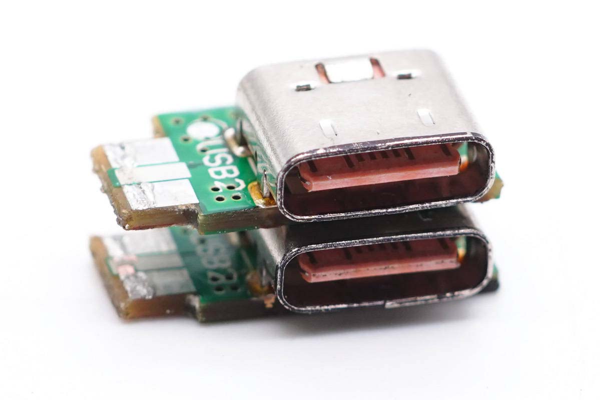 兩個USB-C口母座特寫,過孔焊接。