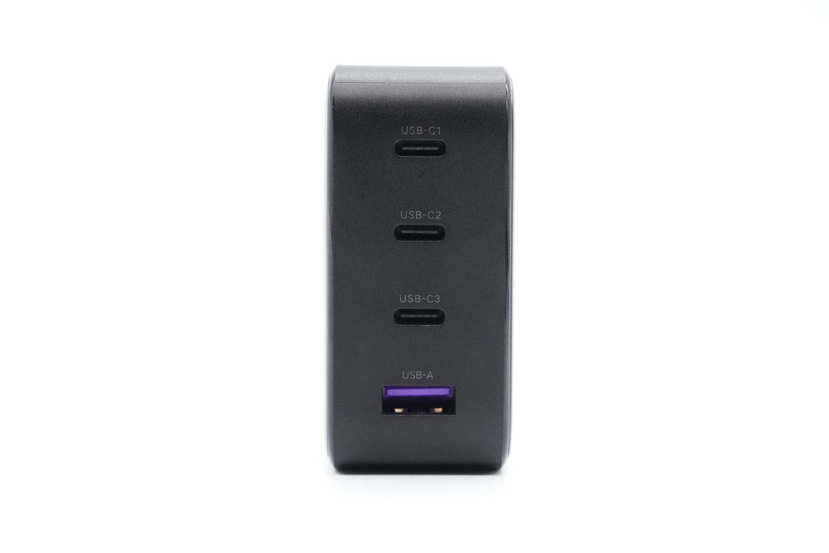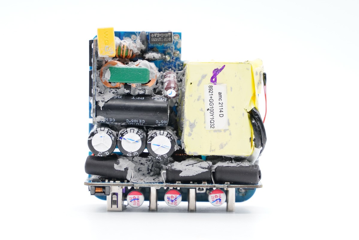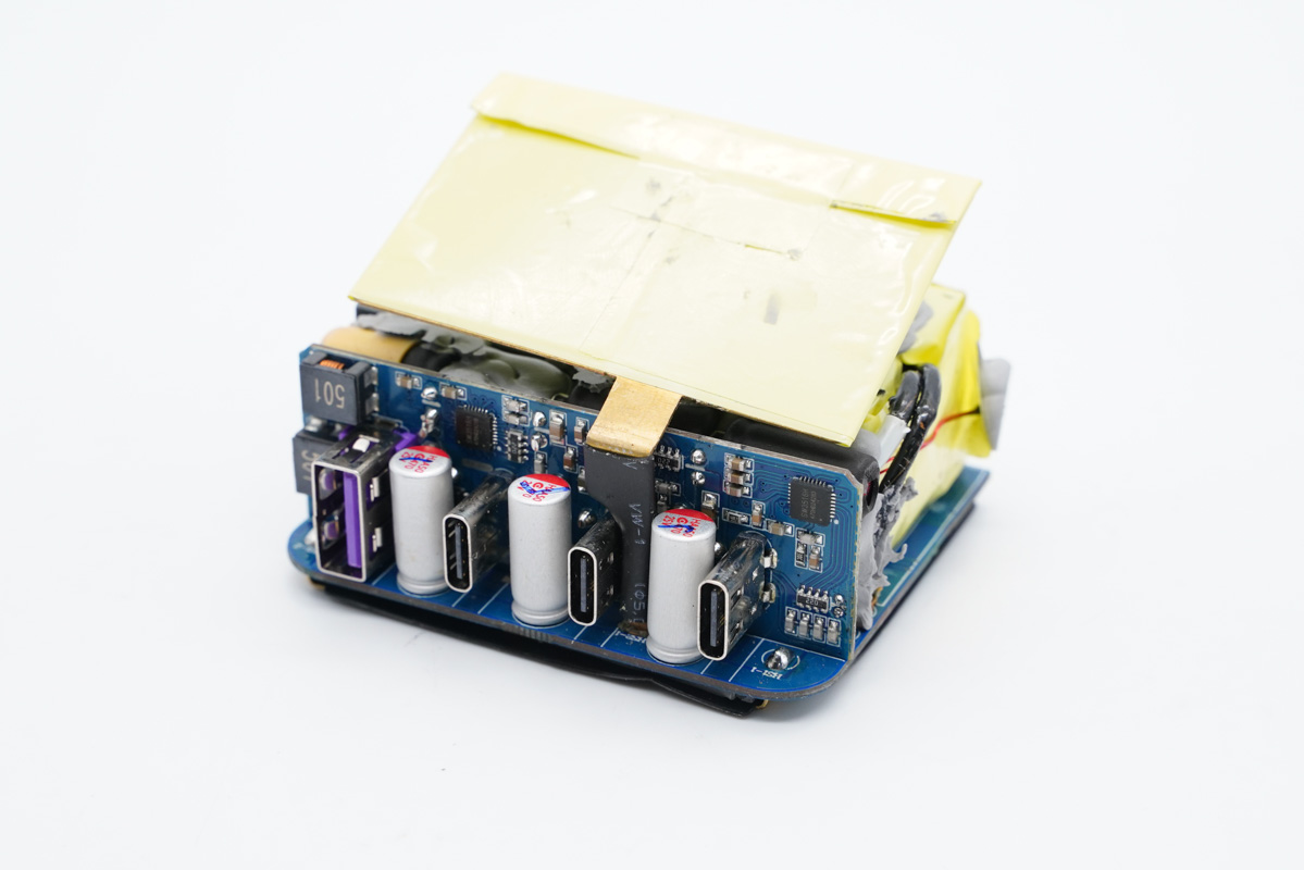 充電器的C1和C2口均支持100W快充,可給筆電等大設(shè)備使用,且支持功率盲插,日常使用會很方便。另外C3口支持22.5W PD快充,可完美適配蘋果iPhone 12,A口支持22.5W SCP快充,可滿足華為手機快充需求,產(chǎn)品整體實用性強。下面充電頭網(wǎng)就對這款充電器進(jìn)行詳細(xì)拆解,看看其用料做工如何。