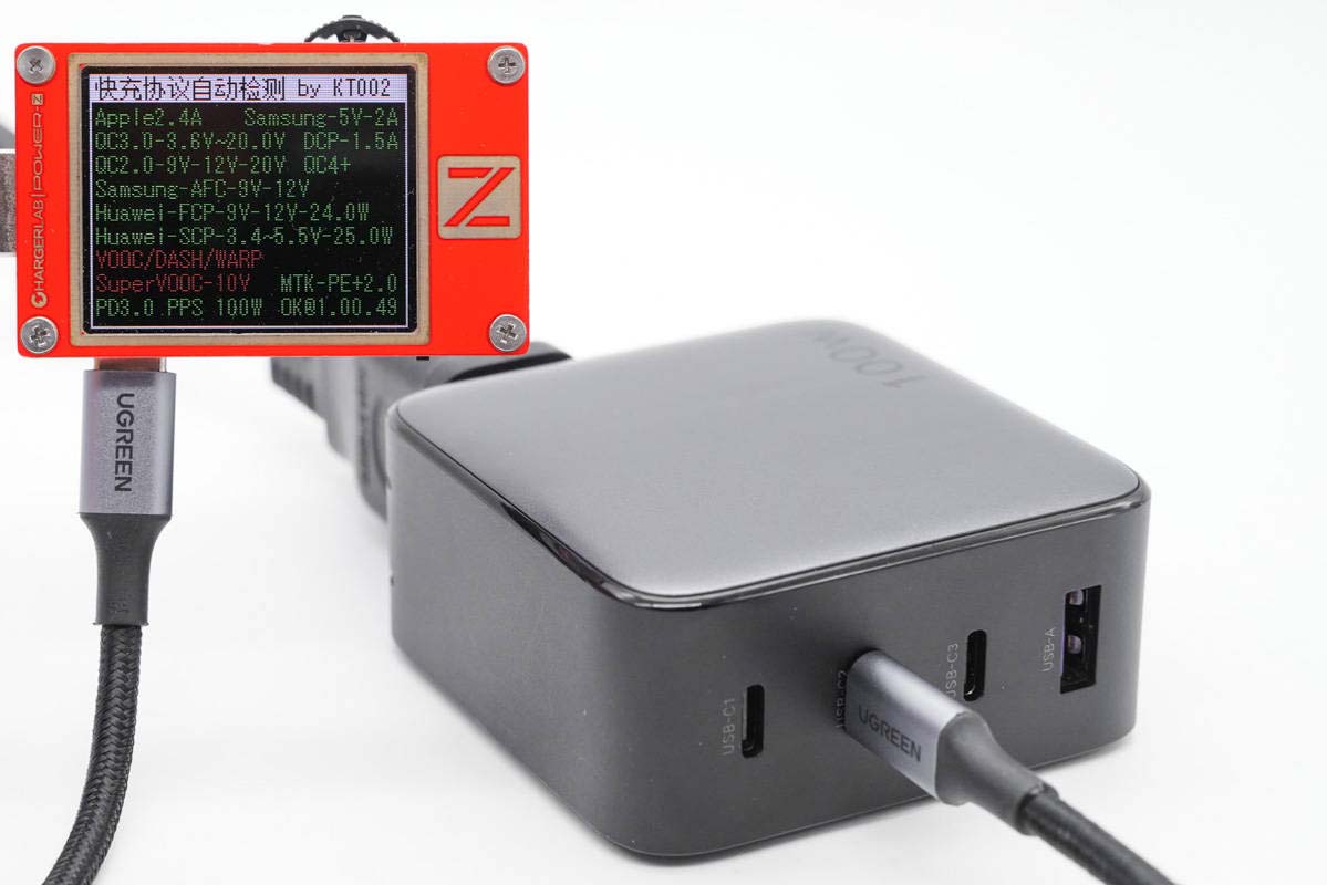 使用ChargerLAB POWER-Z KT002測得USB-C1口支持Apple 2.4A、Samsung 5V2A、DCP協(xié)議,以及QC2.0/3.0、AFC、FCP、SCP、PE2.0、PD3.0、PPS多個快充協(xié)議。