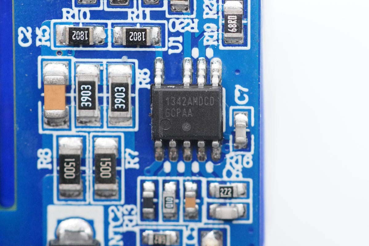 小板背面設(shè)有對應(yīng)降壓電路的降壓電感、二次濾波電容以及一顆MCU,電容和電感均外套絕緣管保護(hù),電感的已經(jīng)被取掉。