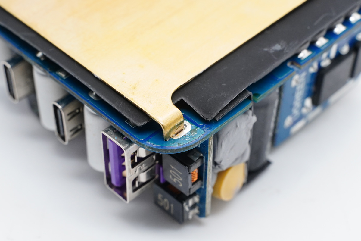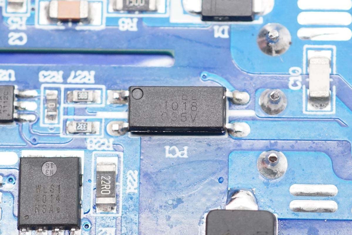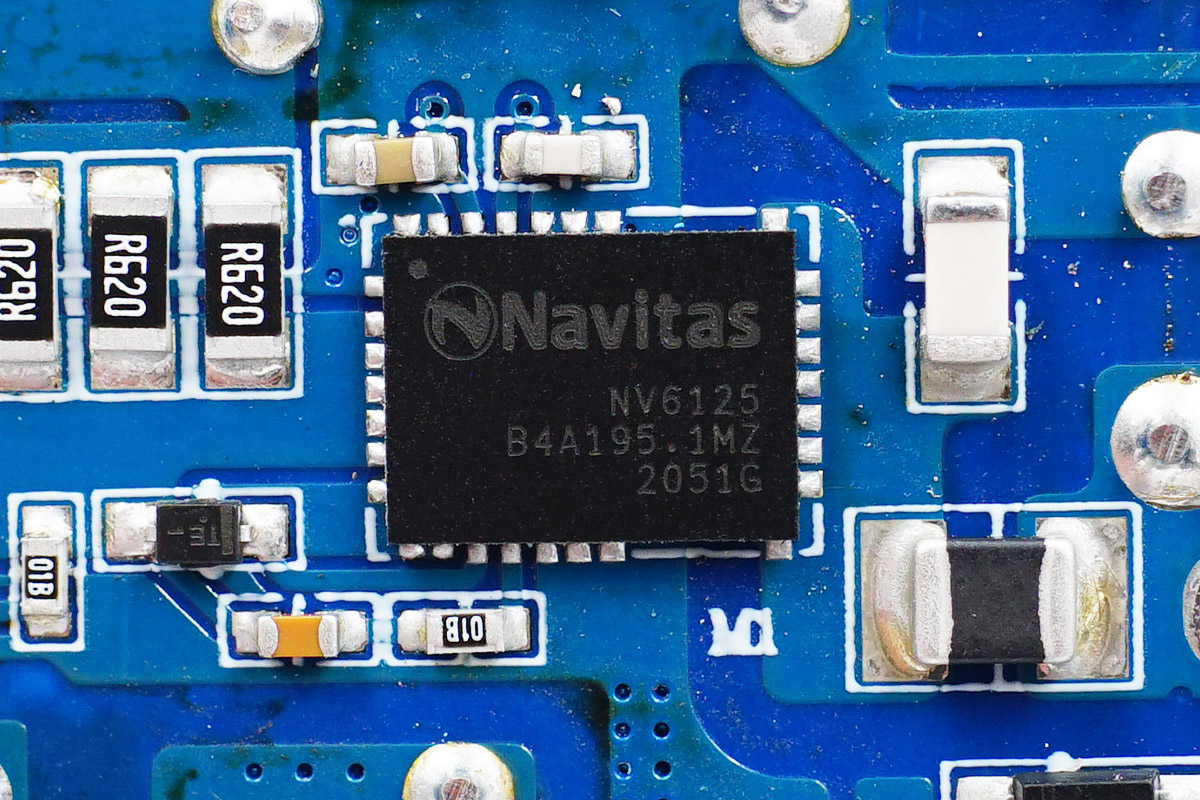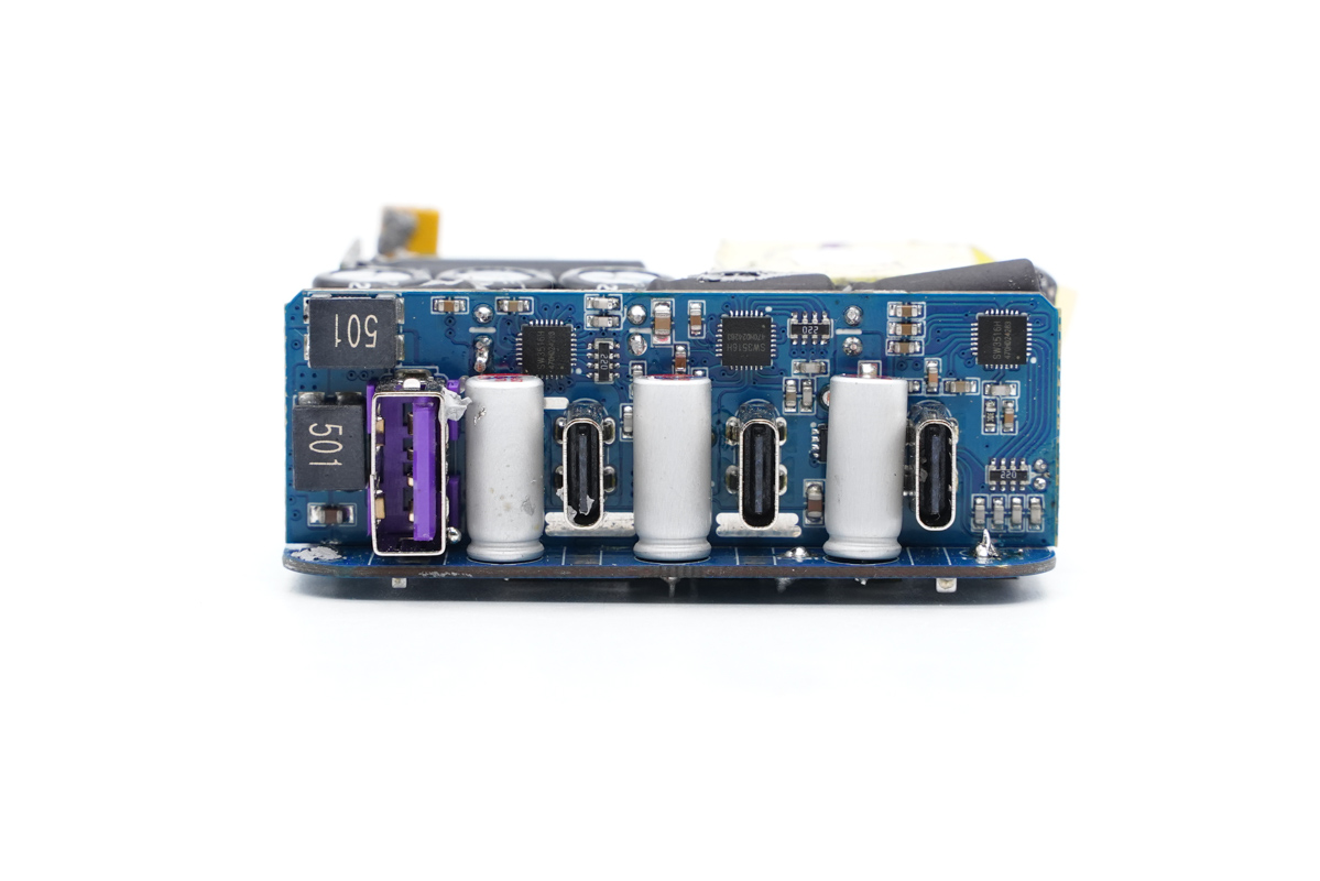 充電頭網(wǎng)通過拆解了解到,充電器輸入端設(shè)有一塊小板,三路降壓電路以及四個USB接口母座均在這塊小板上。充電器開關(guān)電源由安森美NCP1342主控搭配納微NV6125氮化鎵功率芯片。三路輸出均采用智融SW3516H方案,同時采用鈺邦固態(tài)電容進(jìn)行二次濾波,品質(zhì)有保證。