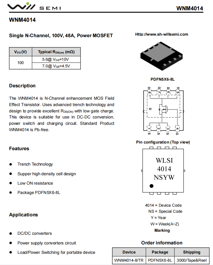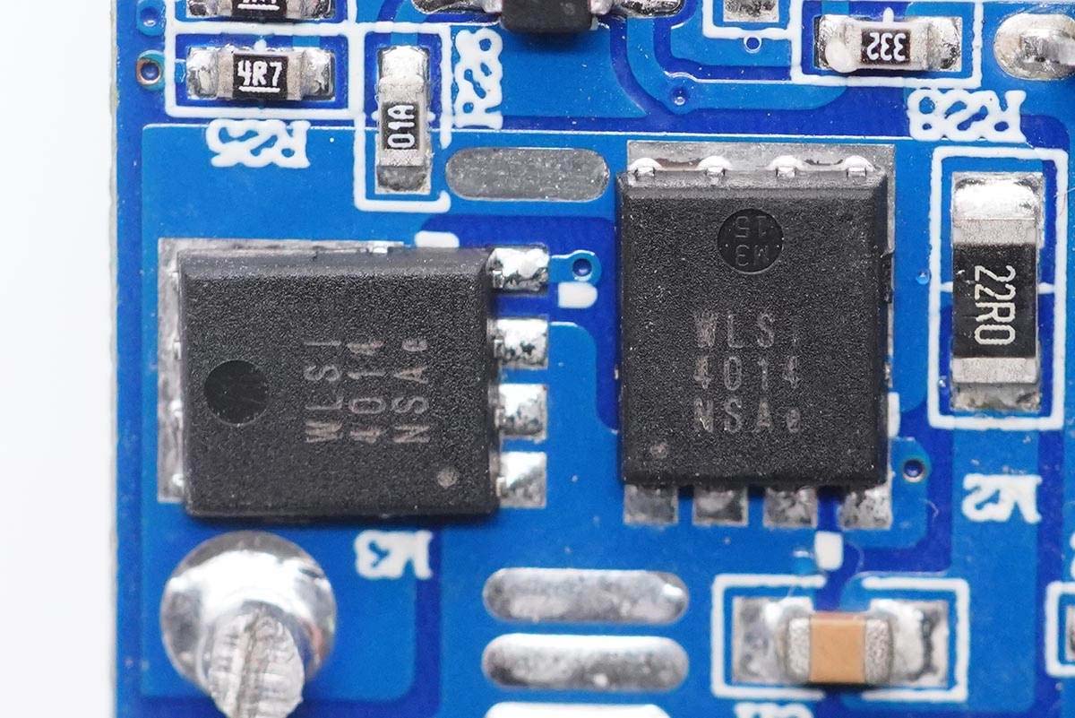 兩顆同步整流管,韋爾半導(dǎo)體WNM4014,NMOS管,耐壓100V,PDFN5x6-8L封裝。