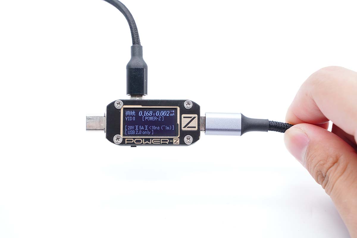 使用ChargerLAB POWER-Z KM001C檢測,顯示該線纜帶有E-Marker芯片,電力傳輸能力為20V5A,數(shù)據(jù)傳輸能力為USB 2.0。