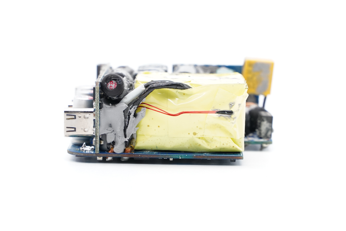 PCB板另一側(cè)是變壓器,并配有熱敏電阻進(jìn)行溫度監(jiān)控。
