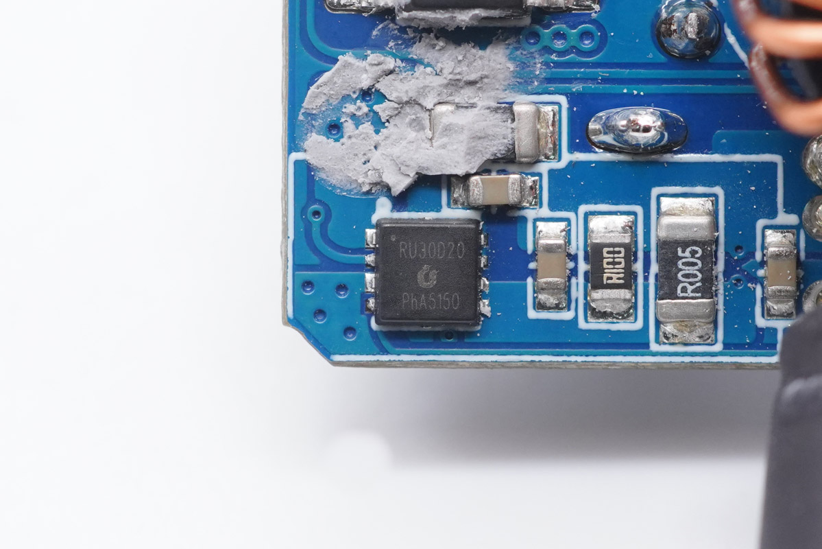 此外還有一顆輸出VBUS開關(guān)管,銳駿RU30D20M2,NMOS管,耐壓30V,PDFN3333封裝,用于C3和A端口分配。