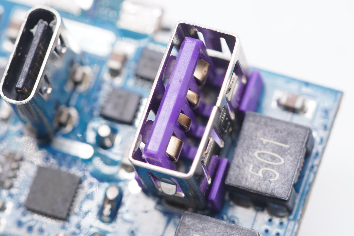 輸出端一覽,USB母座間共有三顆輸出濾波固態(tài)電容。