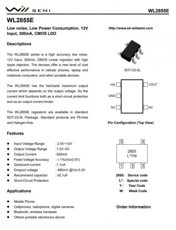 韋爾 WL2855E 3.3V 300mA輸出穩壓管,最高輸入電壓12V,輸出3.3V為主控單片機供電。