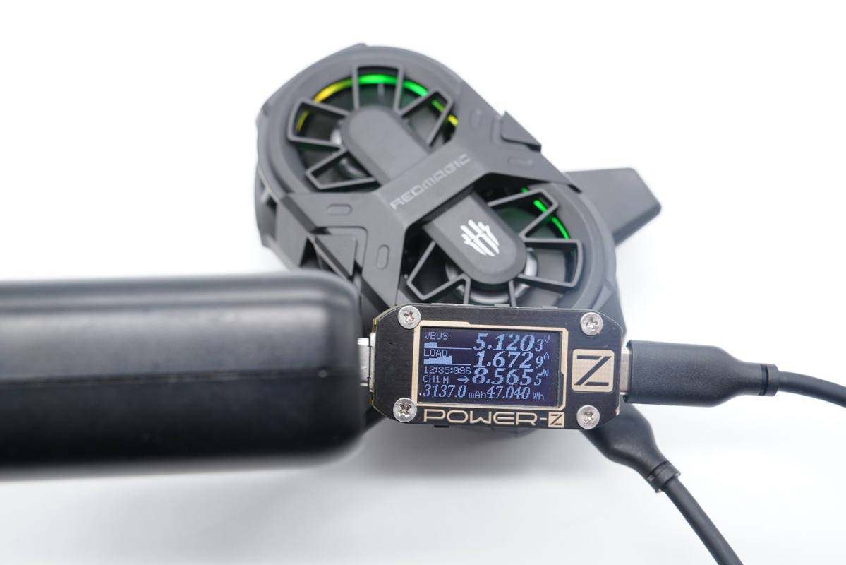 接通電源,背夾工作情況下使用ChargerLAB POWER-Z KM001C測得輸入功率為5.12V 1.67A 8.57W。
