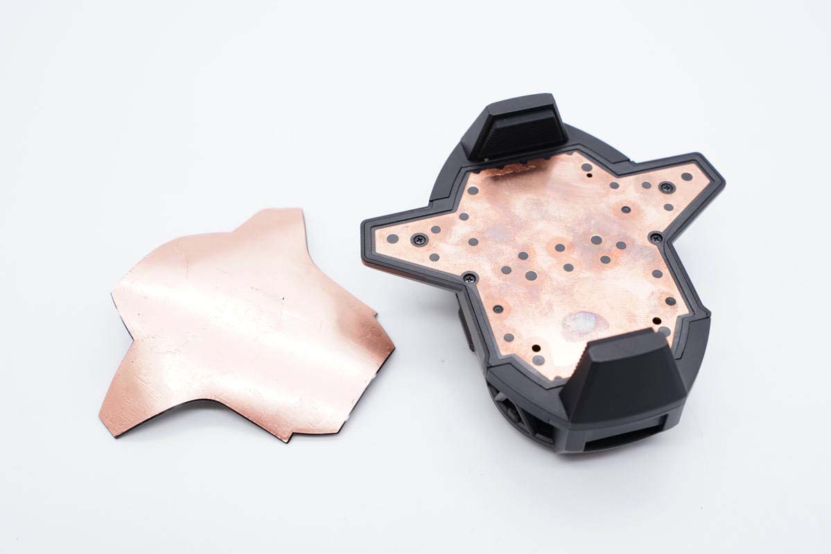 將背夾貼合面導冷墊撕下,其背面貼有一層銅箔,機身殼使用四顆螺絲封裝固定。