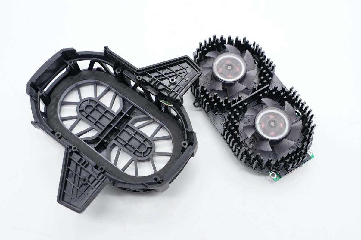 拆掉螺絲取出鋁合金散熱板,另一面固定兩個小風扇,周圍都布滿了扁平散熱柱。