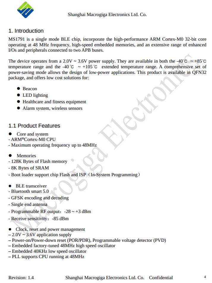 主控芯片采用巨微MS1791,這是一顆32位基于 ARM Cortex M0+核心的藍牙低功耗芯片。