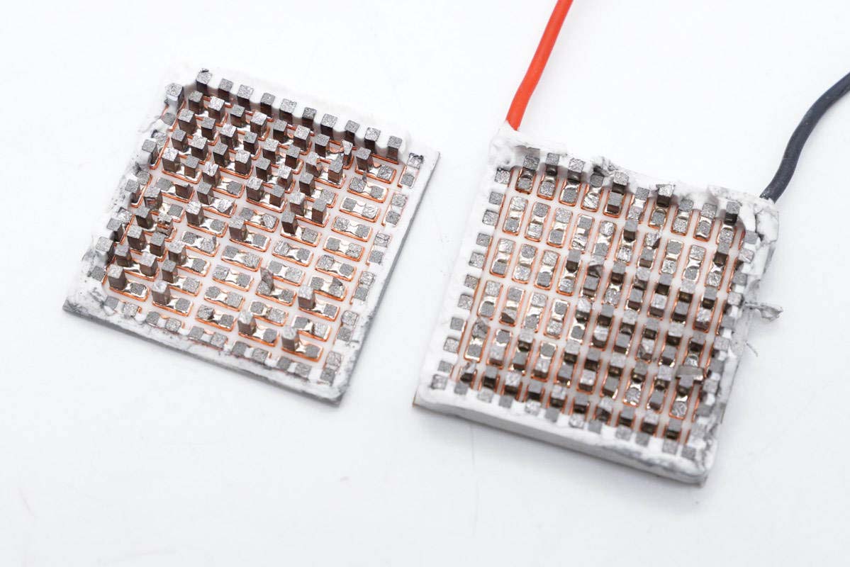制冷晶片拆開,內設很多方形PN結小柱子,兩個一組。