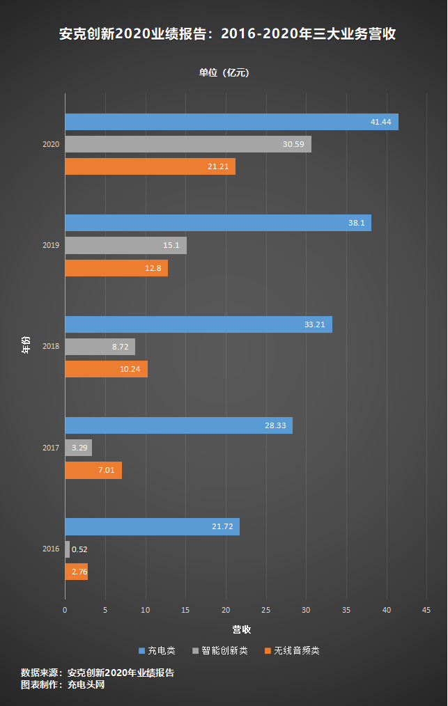 根據安克2020年財報,充電類產品實現營收41.44億元,占營業總收入比例為44.31%。某種意義上,在600億市值中,安克的充電類產品支持起了270億左右。