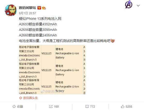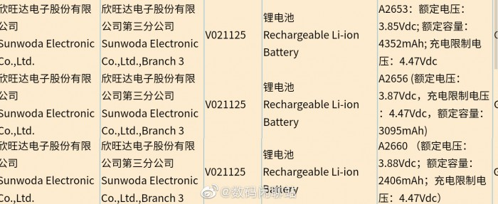 根據(jù)@數(shù)碼閑聊站爆料,疑似iPhone 13系列電池入網(wǎng):