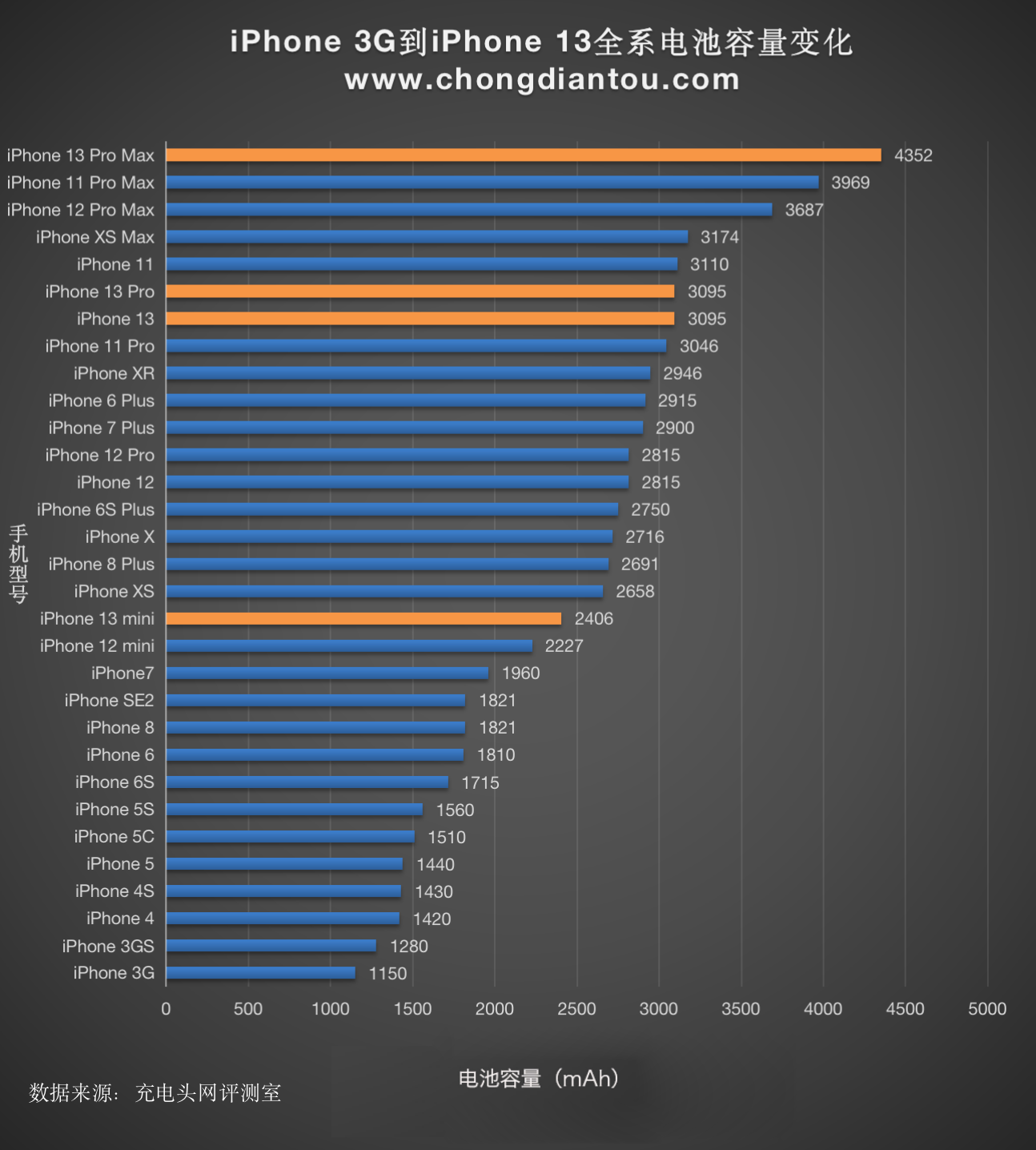 如果爆料為真,可以看出iPhone 13的“超大杯”進步最大,電池漲幅接近五分之一,屬實不容易!將爆出的iPhone 13系列放進充電頭網(wǎng)統(tǒng)計的iPhone 全系電池容量變化表中,可以看到iPhone 13 Pro Max一騎絕塵,iPhone 13/ 13 Pro也僅次于歷代的超大杯和以大電池著稱的iPhone 11;即使是iPhone 13 mini,也可以在排行榜占據(jù)中游。