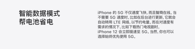 蘋果在產(chǎn)品頁面也近乎明示:當不需要 5G 速度時,比如在后臺進行更新,它就會自動轉(zhuǎn)用 LTE 網(wǎng)絡(luò),以節(jié)約電量。換句話說,5G不是那么“節(jié)約電量”唄。
