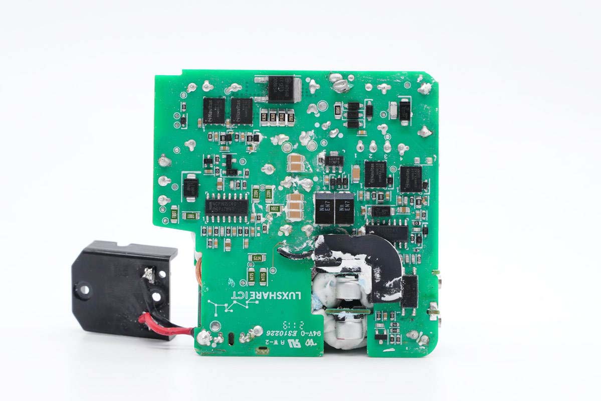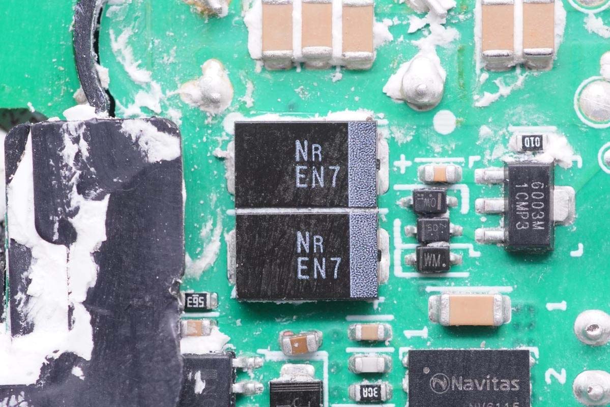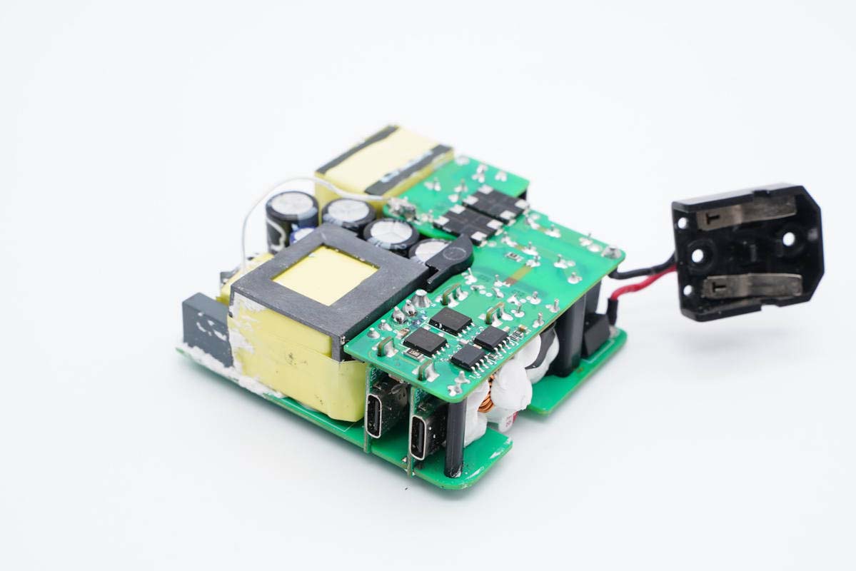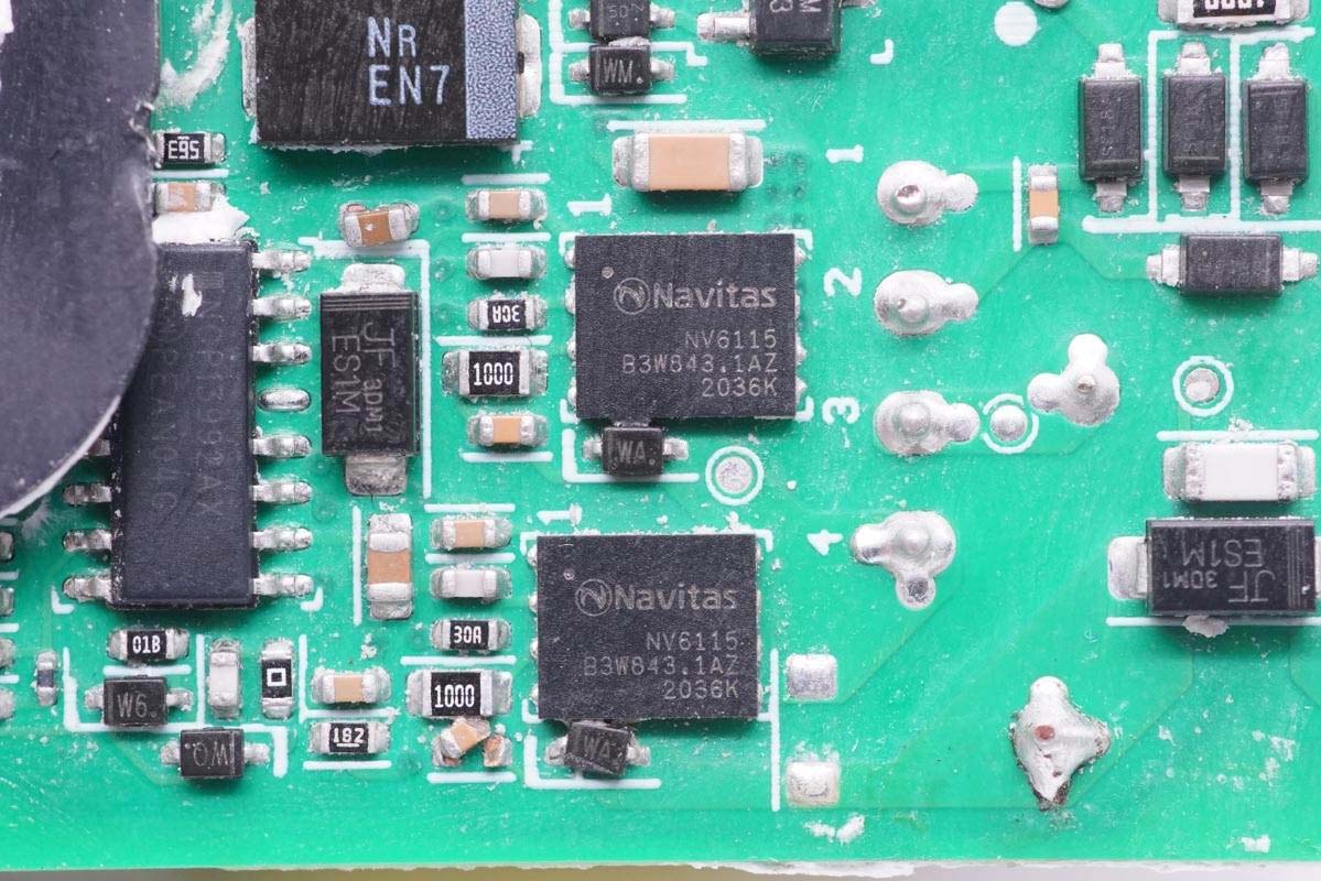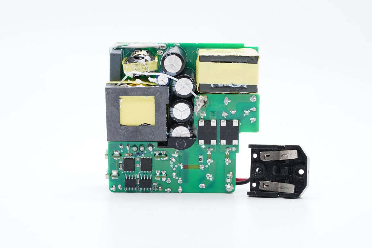 主板背面可以看到四顆納微的開關(guān)管,左上角兩顆用于PFC升壓開關(guān)管,頂部是PFC整流管,右側(cè)兩顆是LLC開關(guān)管。PCB上印有“LUXSHARE ICT”字樣,由立訊精密代工。