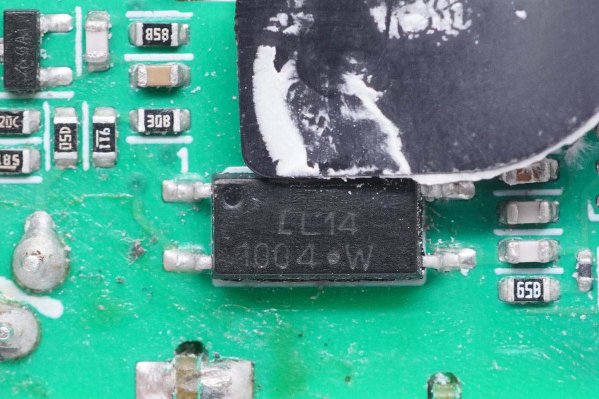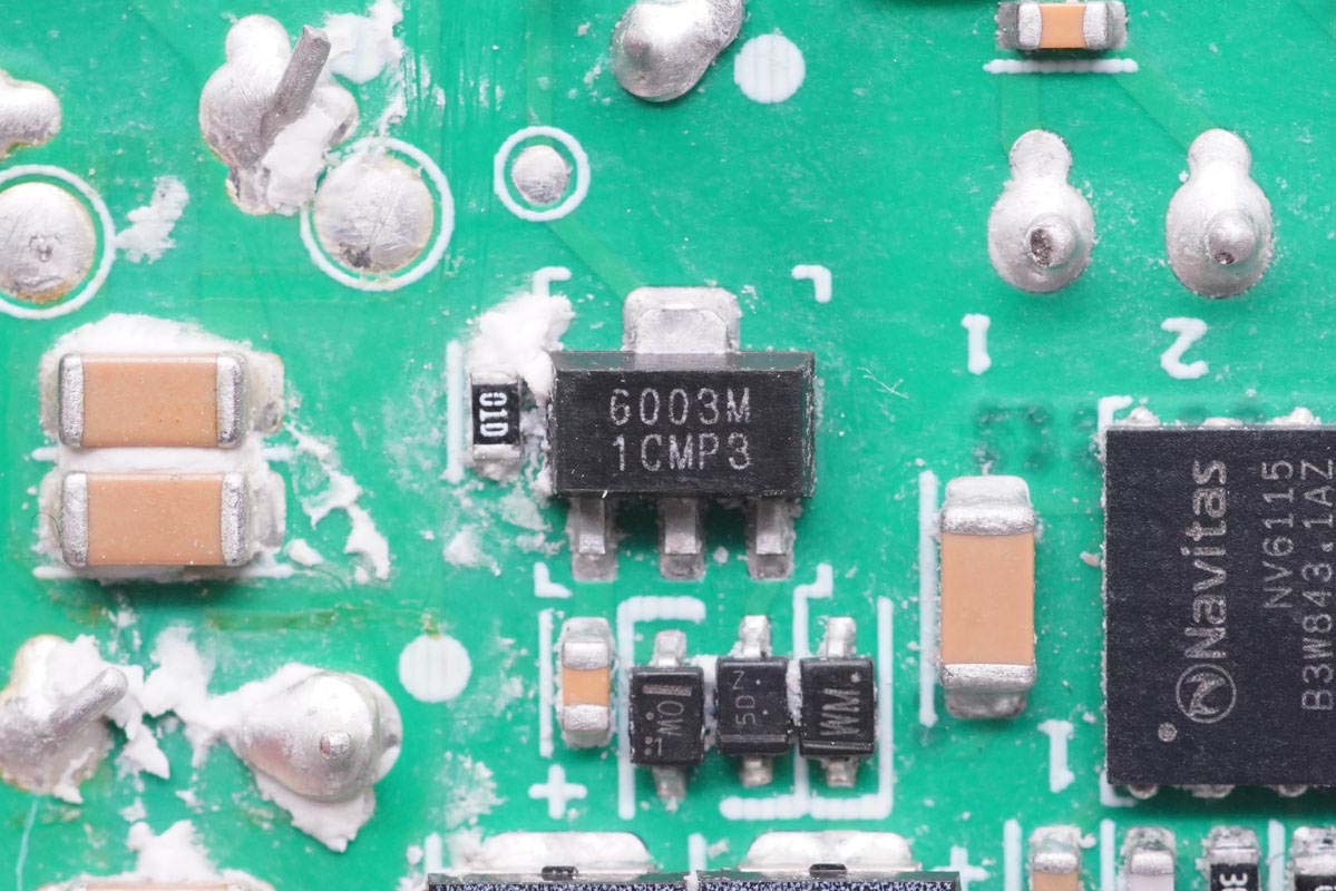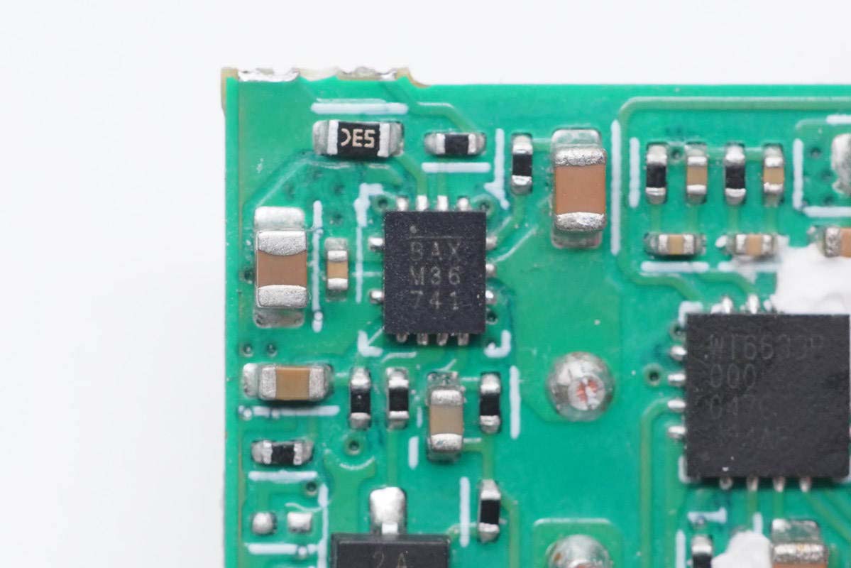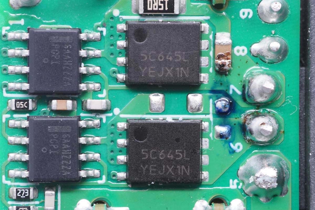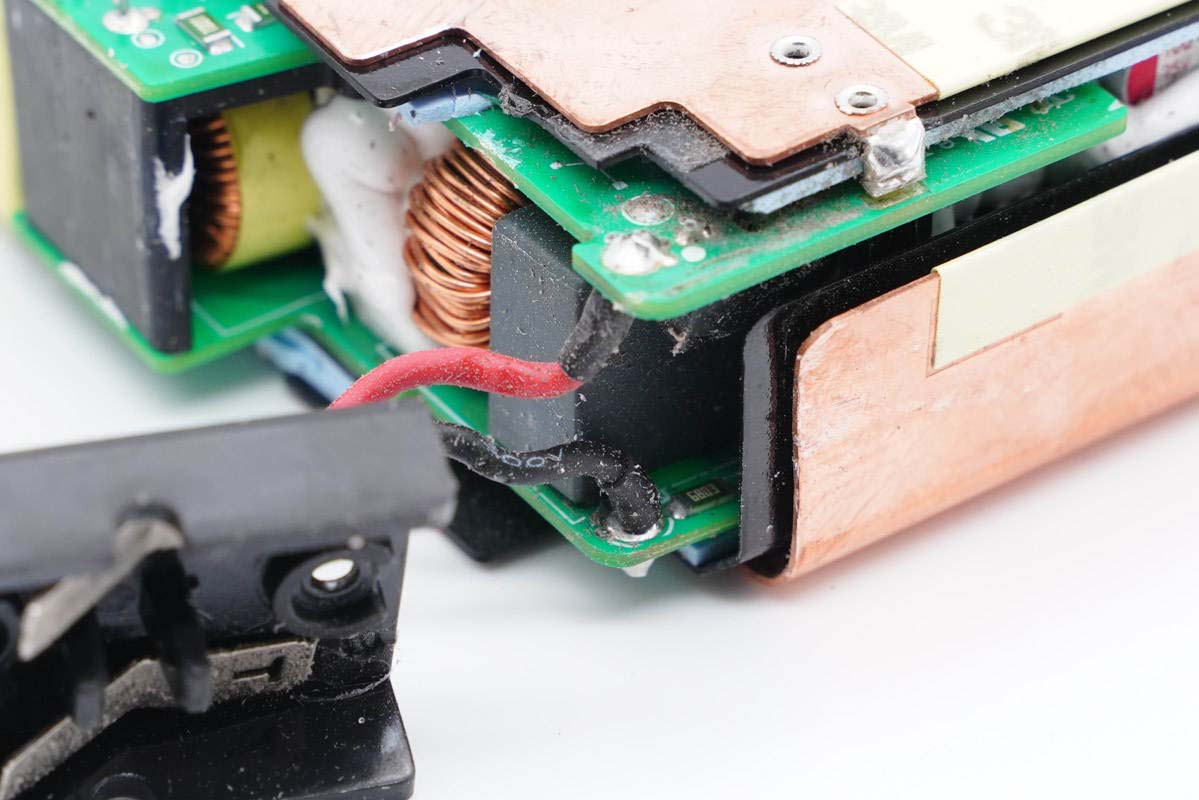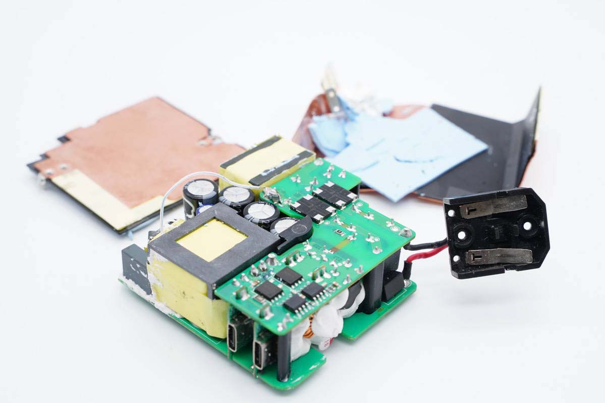 主板背面可以看到四顆納微的開關(guān)管,左上角兩顆用于PFC升壓開關(guān)管,頂部是PFC整流管,右側(cè)兩顆是LLC開關(guān)管。PCB上印有“LUXSHARE ICT”字樣,由立訊精密代工。