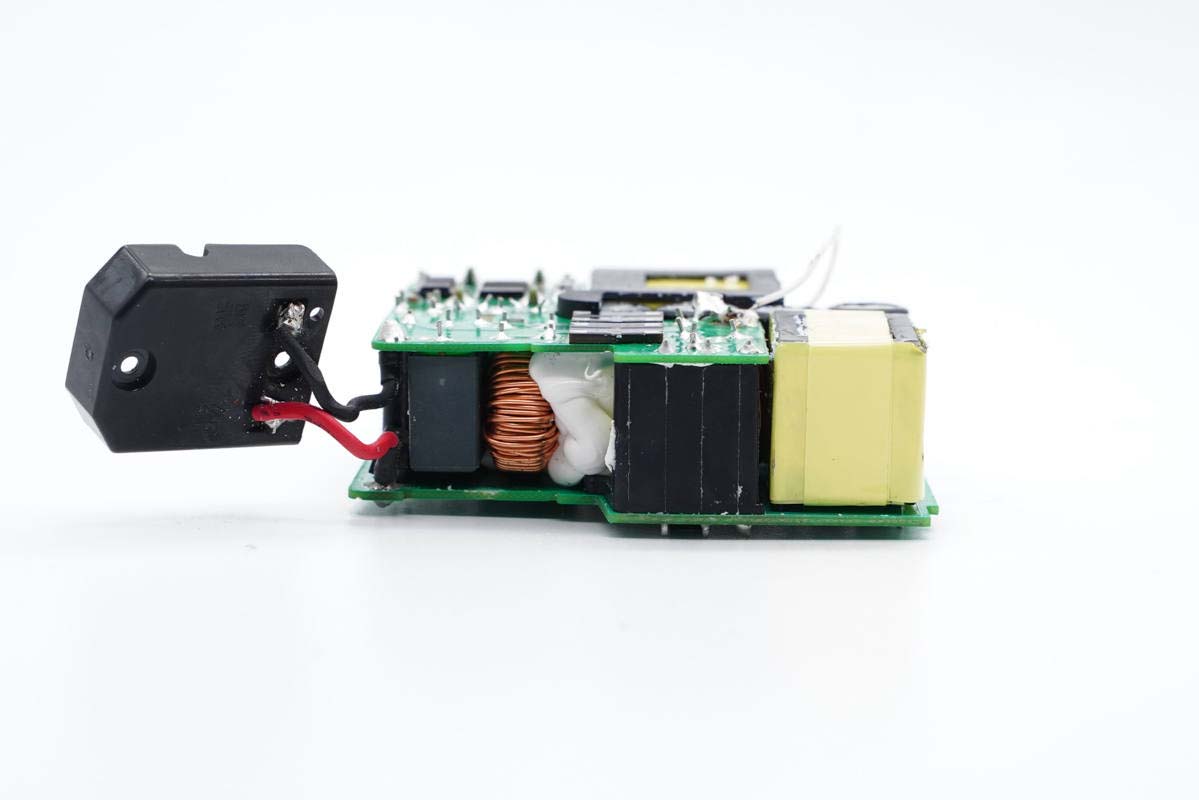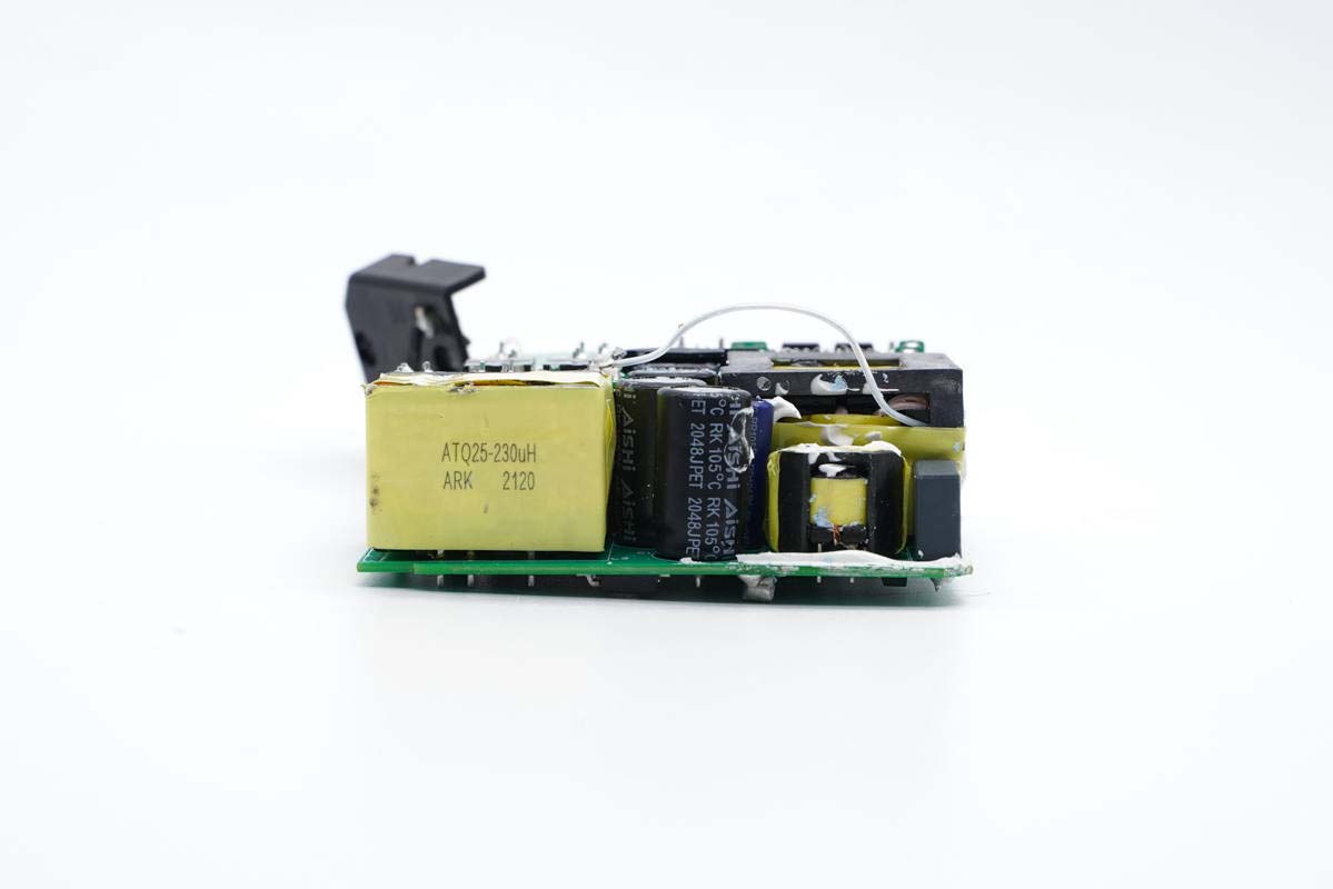 輸入端采用AC導(dǎo)線連接通電,夾層間可以看到安規(guī)X電容以及共模電感等器件。