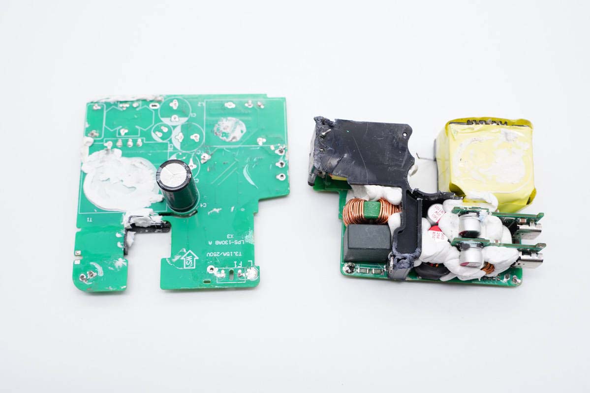 將兩塊板子拆分開,主板上的電容、PFC升壓電感等已被拆掉,另一顆Z型小板上,元器件打膠加固。