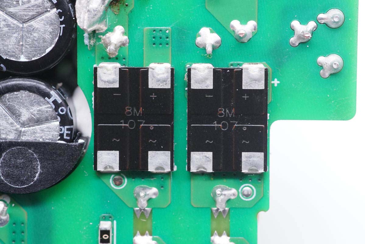 上面這塊小板,左邊是低壓部分,變壓器輸出同步整流,采用LLC架構(gòu)。右側(cè)是兩顆整流橋,用于輸入整流,右上角是PFC升壓電感,中間是初級濾波電容。