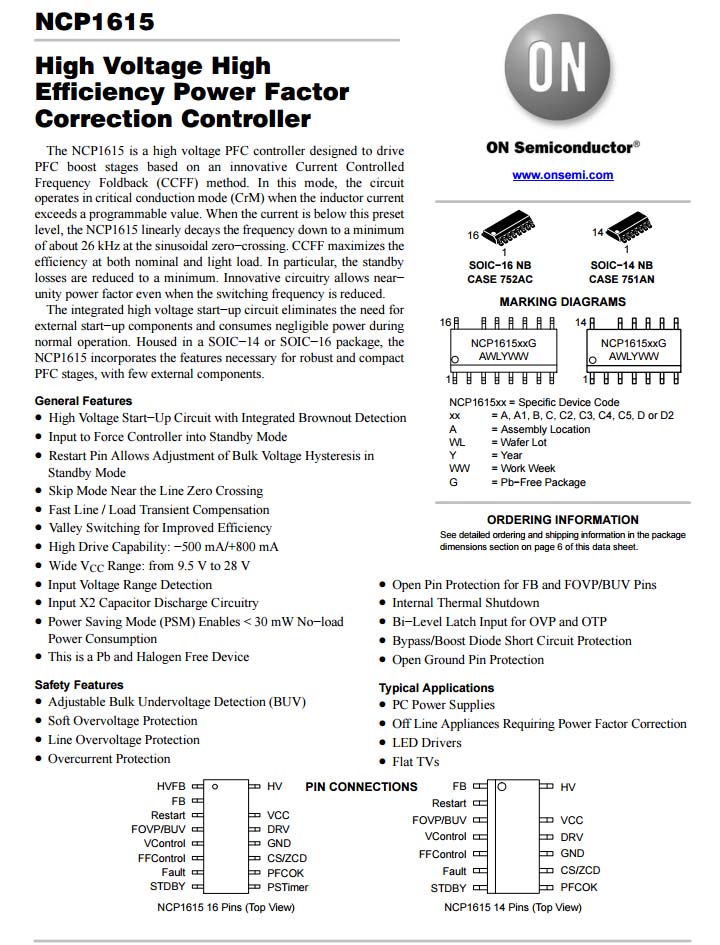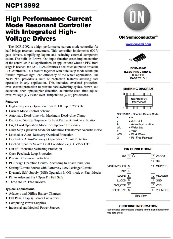 開關(guān)電源主控芯片采用安森美NCP13992,高性能電流模式諧振LLC控制器,內(nèi)部集成高壓驅(qū)動器,支持最高750KHz工作頻率。