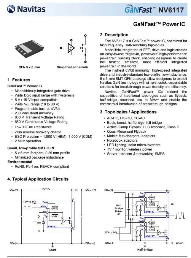 PFC開關(guān)管采用兩顆納微NV6117并聯(lián),NV6117內(nèi)部集成氮化鎵開關(guān)管,驅(qū)動器以及邏輯控制電路,耐壓650V,Rds_ON為120mΩ,支持800V瞬態(tài)耐壓,采用QFN5*6封裝。