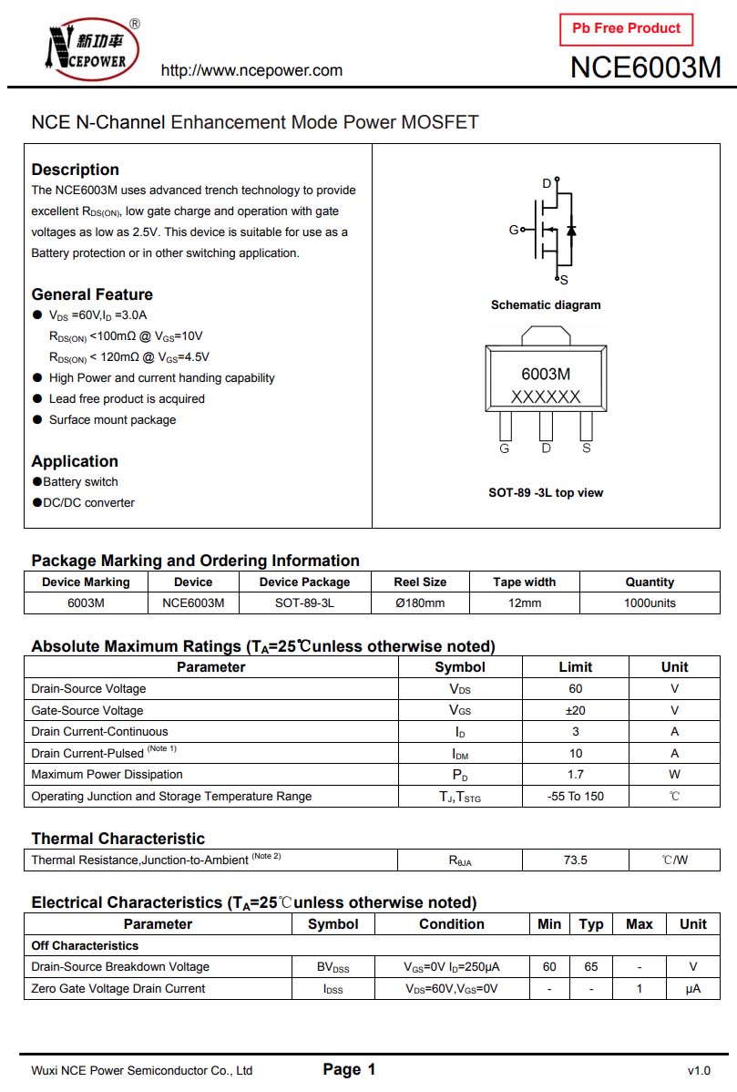 為主控芯片供電的MOS管,采用無錫新功率,NCE6003M,耐壓60V,用于穩(wěn)壓為主控芯片供電。