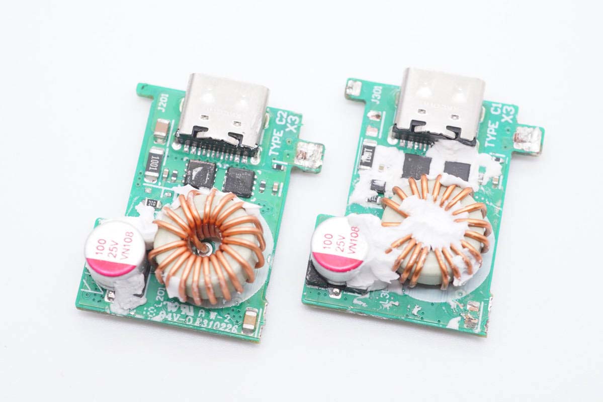通過觀察發(fā)現(xiàn),這款充電器采用PFC+LLC架構(gòu),使用氮化鎵+碳化硅第三代寬禁帶半導(dǎo)體組合,次級同步整流輸出固定電壓。使用兩路獨(dú)立的協(xié)議芯片和同步整流降壓輸出,并且支持多口自動分配功率。兩塊電路板的結(jié)構(gòu),將整流橋,開關(guān)管和同步整流管分開,均勻散熱,避免局部溫升過高。