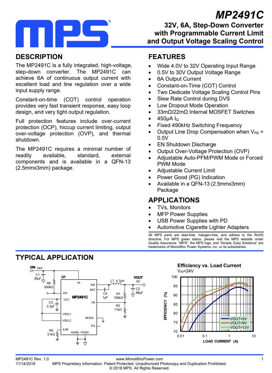 兩個USB-C接口采用MPS MP2491C同步整流降壓轉(zhuǎn)換器降壓輸出。MP2491C支持最高32V輸入,輸出電壓最高30V,最大輸出電流6A,內(nèi)置33mΩ/22mΩ同步降壓管,支持可調(diào)節(jié)的電流限制。采用2.5*3mm QFN-13封裝。