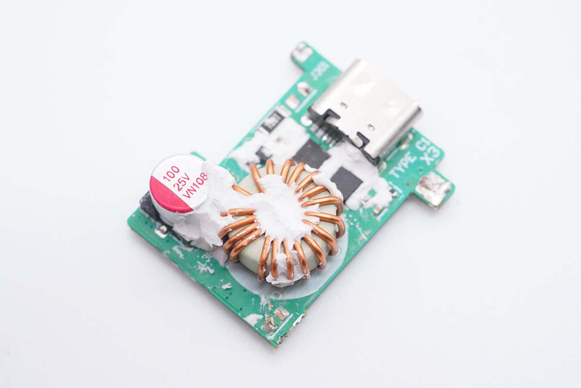 另一面設(shè)有同步整流降壓轉(zhuǎn)換器、協(xié)議IC以及輸一顆MOS管,接口背面還有TVS進(jìn)行靜電保護(hù)下面我們以其中一塊小板為例進(jìn)行詳細(xì)了解,不多贅述。
