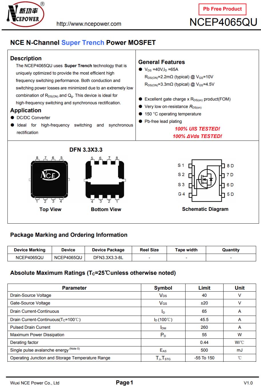 無錫新功率 NCEP4065QU 詳細(xì)資料。