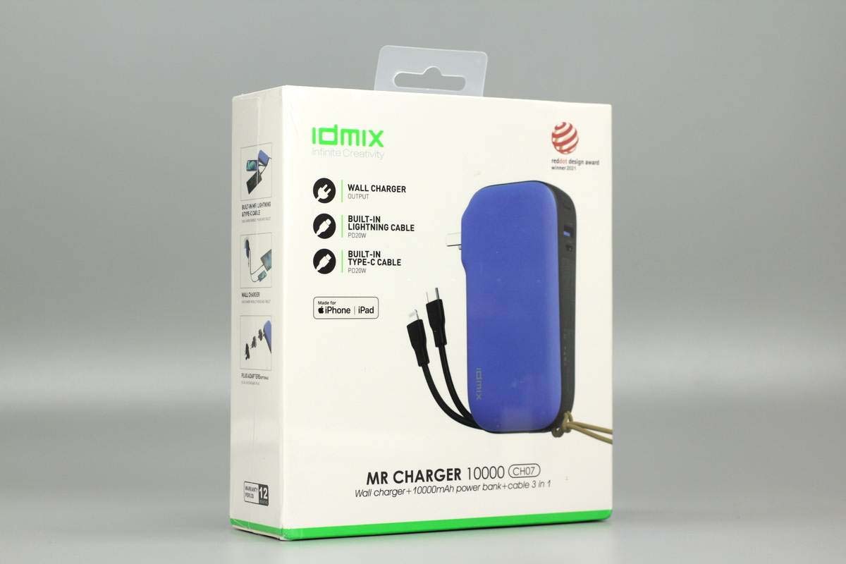 包裝盒頂部帶有塑料掛鉤,正面印有IDMIX品牌、移動電源外觀和名稱、MFI認證標識等。