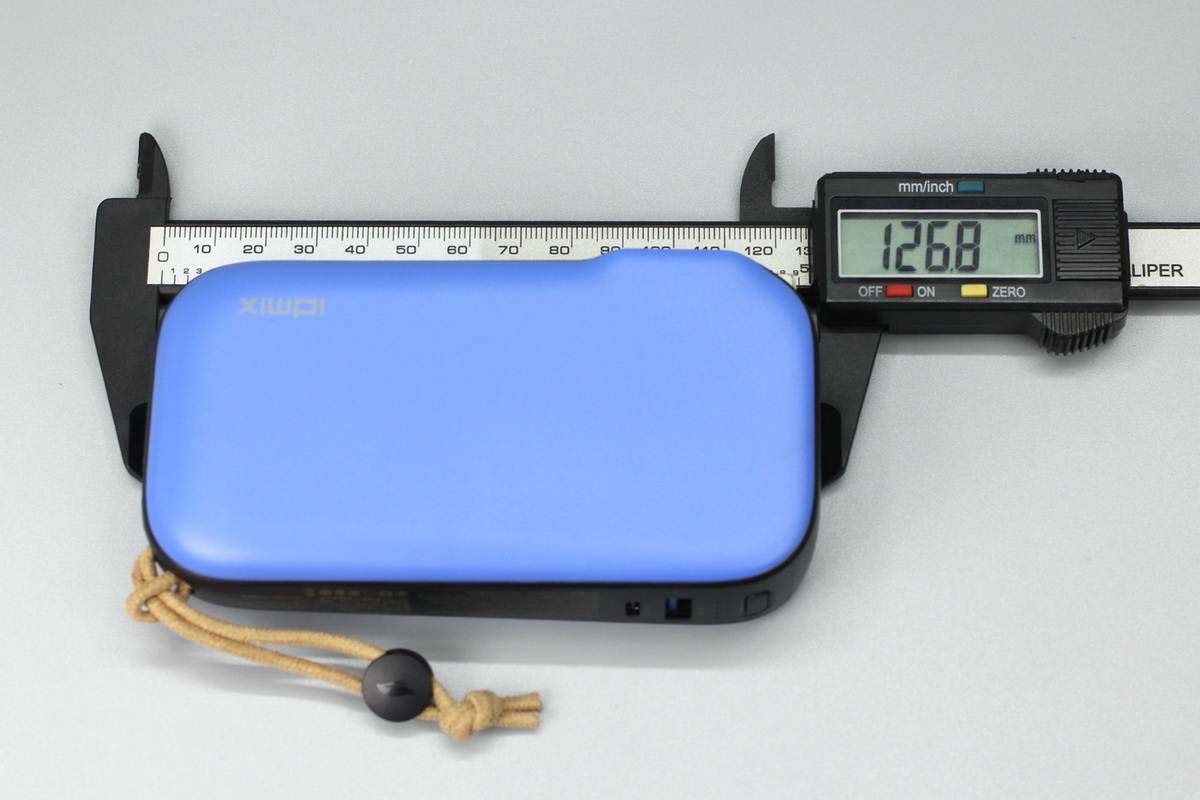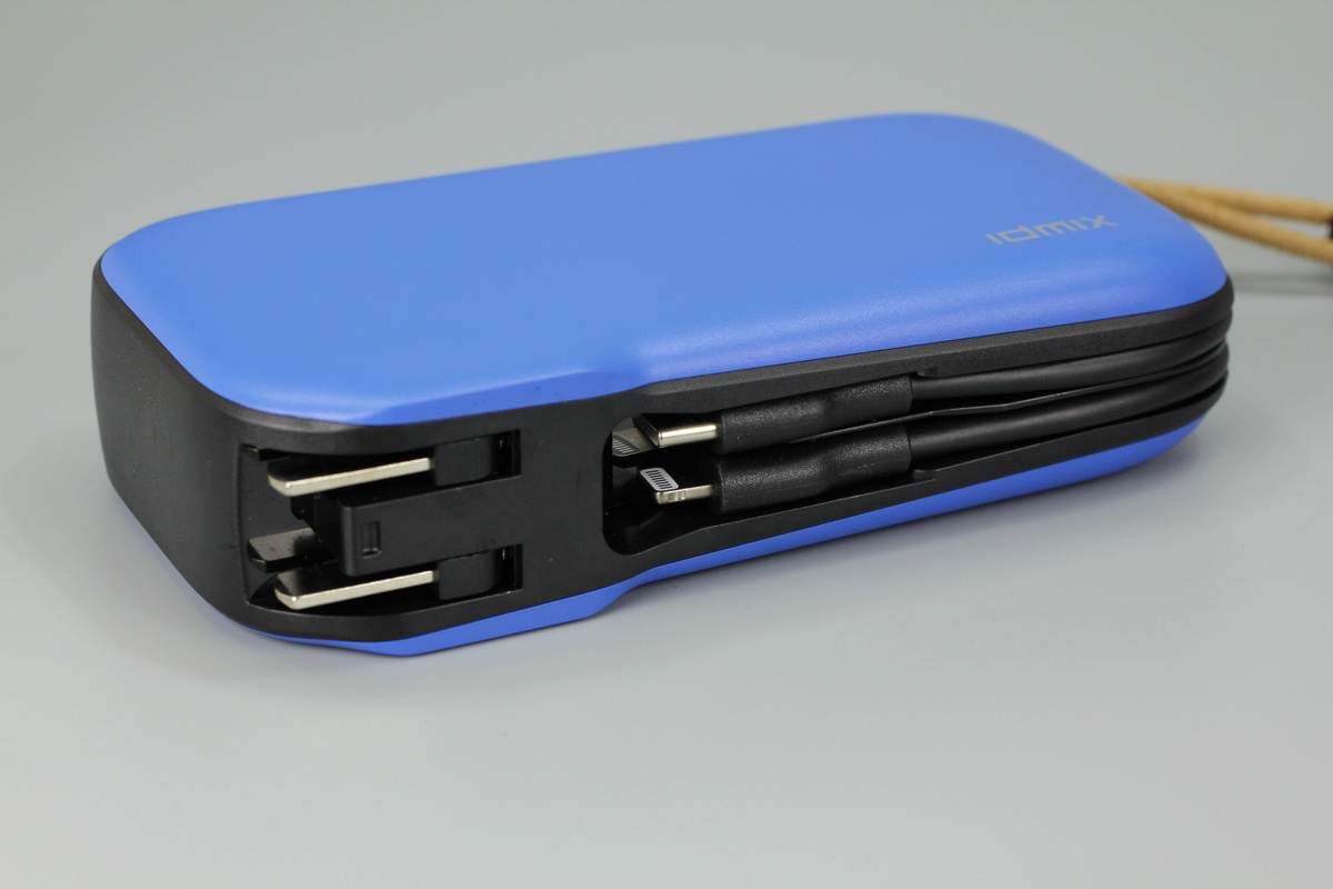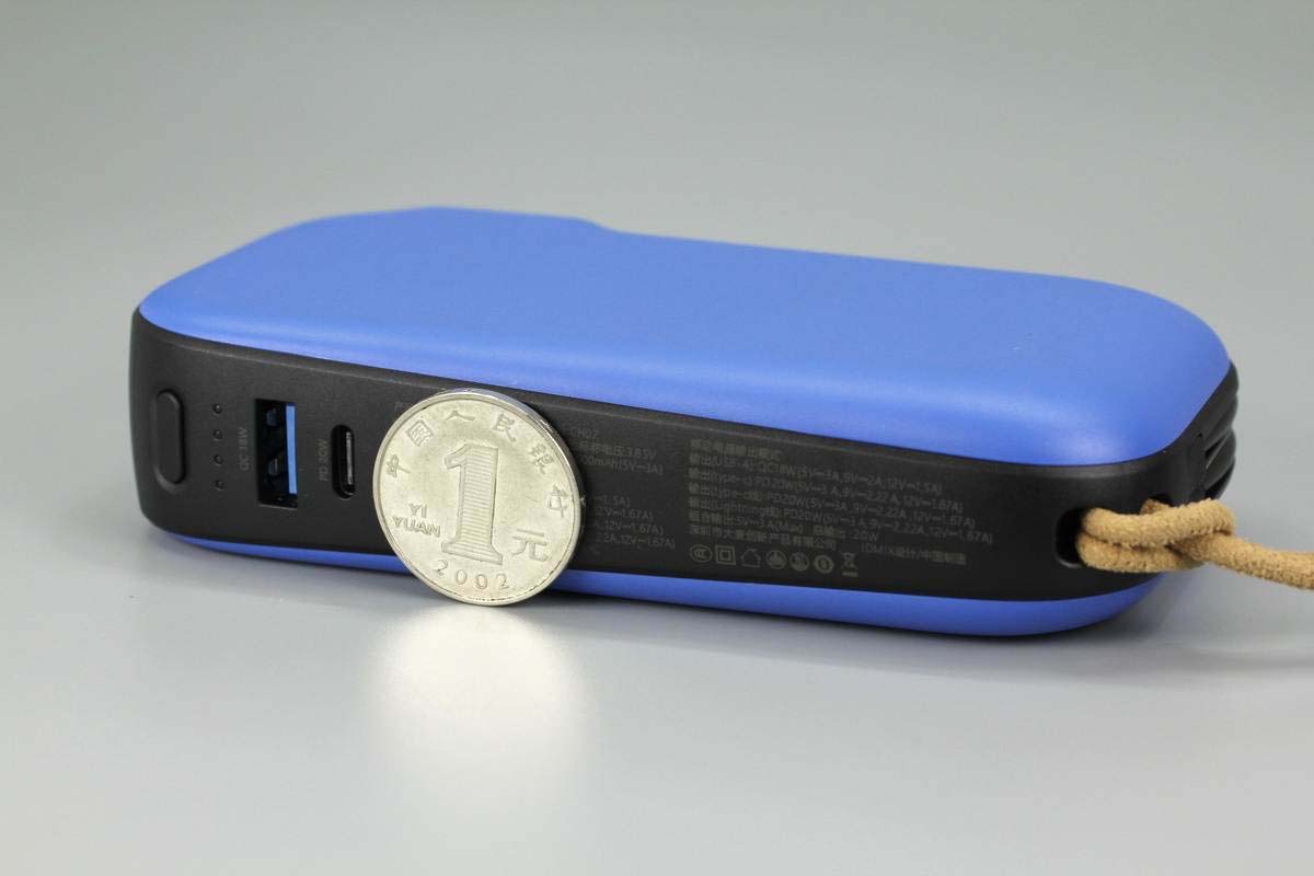移動電源藍黑配色,機身殼表面磨砂,邊緣圓潤握持手感好。其中一端設計有提繩,方便攜帶。