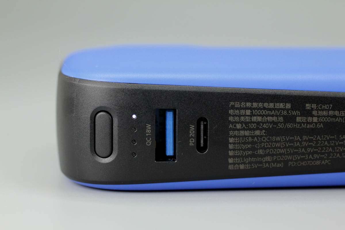 側面一端設有電源鍵、LED電量指示燈以及1A1C接口,接口旁印有對應輸出功率標識。