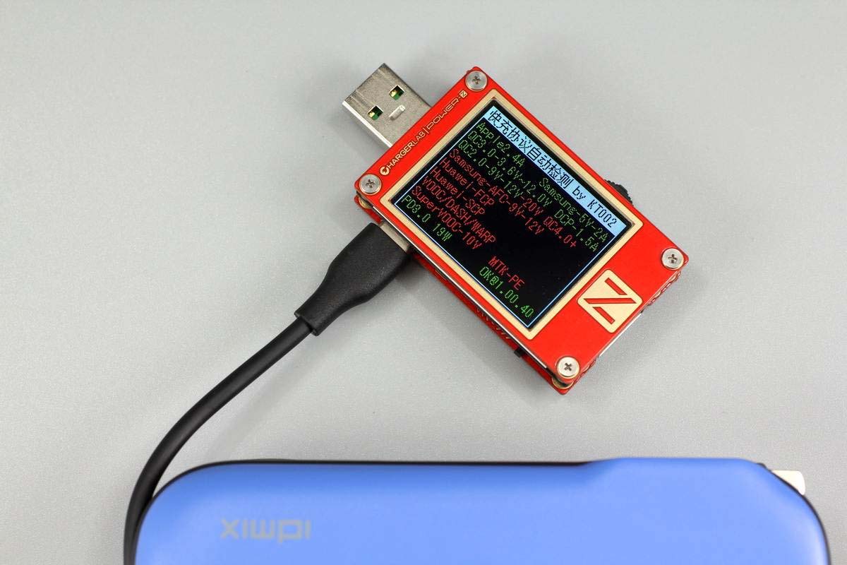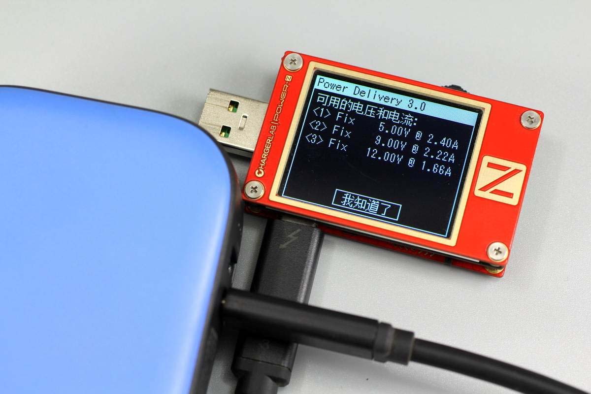 移動電源模式下,使用ChargerLAB POWER-Z KT002測得USB-A口支持Apple 2.4A、Samsung 5V2A、DCP協議,以及QC2.0、QC3.0快充協議。