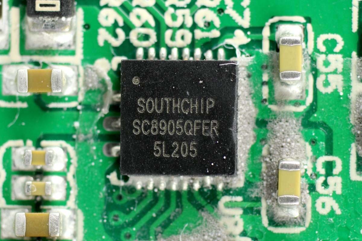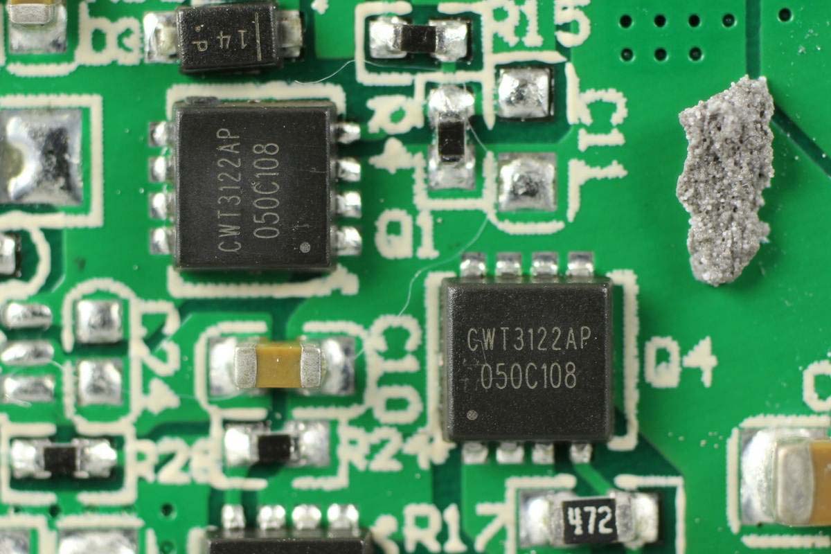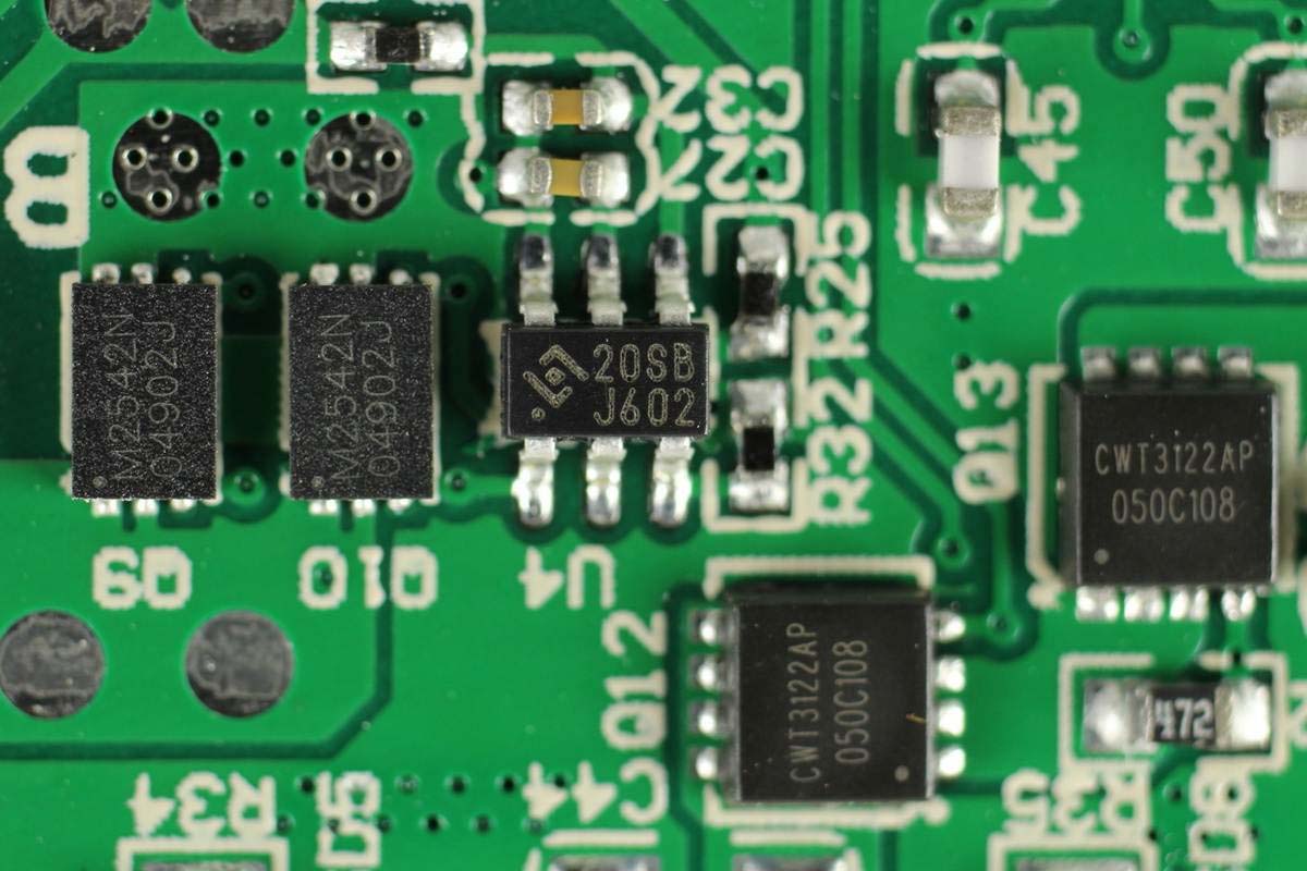 絲印20SB鋰電池保護芯片,來自HYCON宏康,左邊是兩顆鋰電保護MOS管,右下角兩顆用于線纜輸出保護。