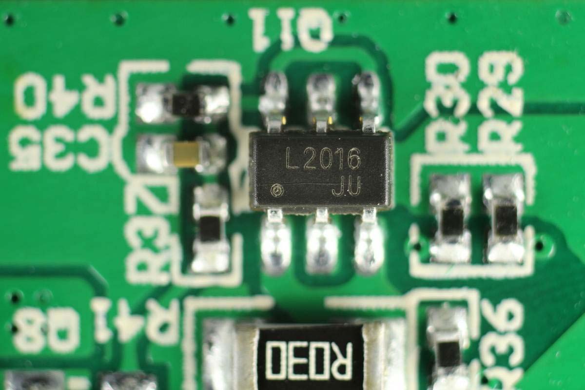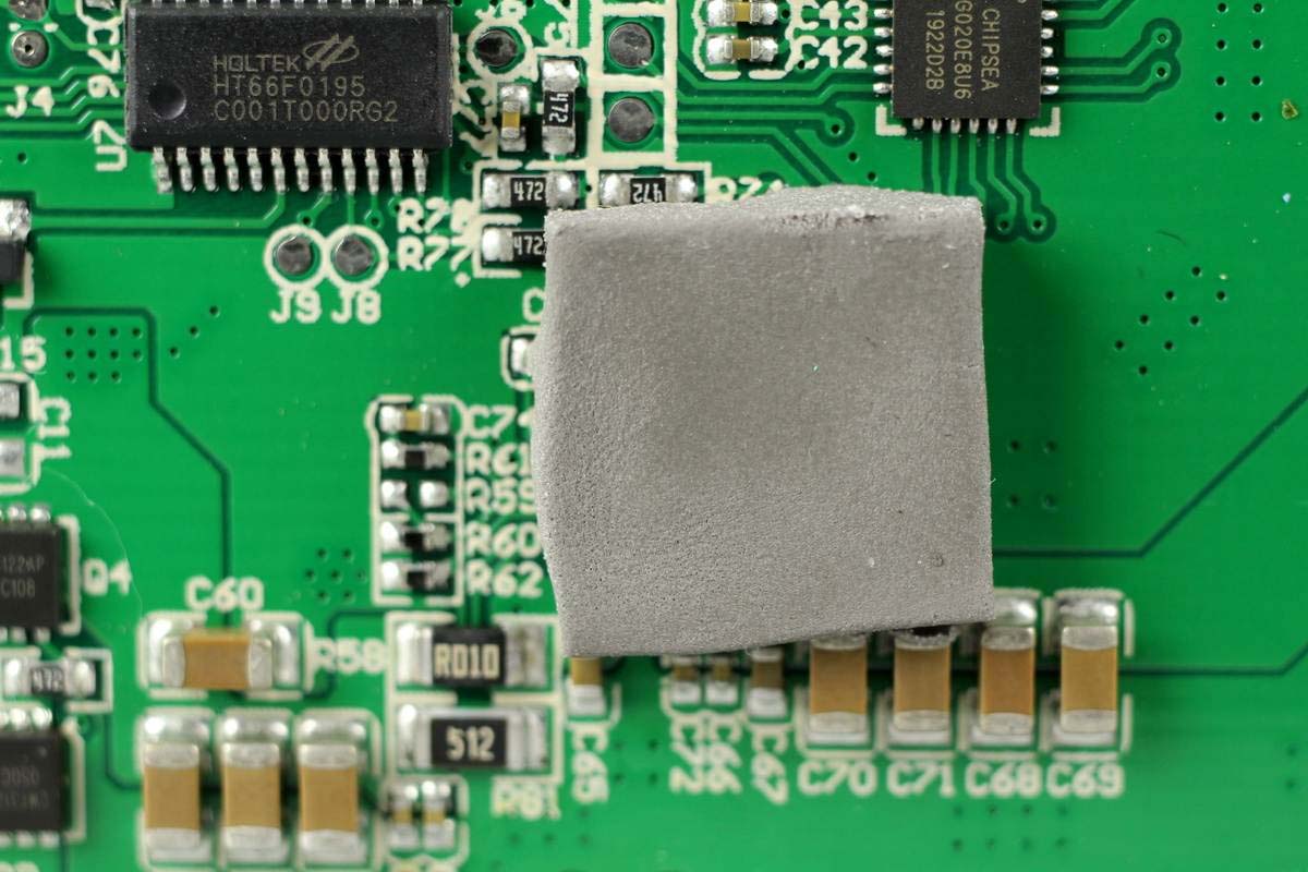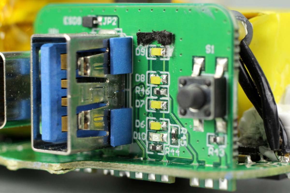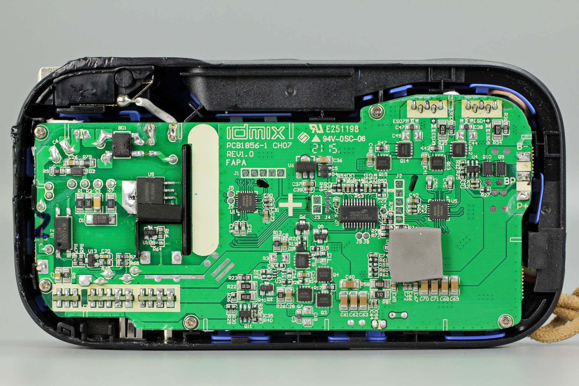 絲印20SB鋰電池保護芯片,來自HYCON宏康,左邊是兩顆鋰電保護MOS管,右下角兩顆用于線纜輸出保護。