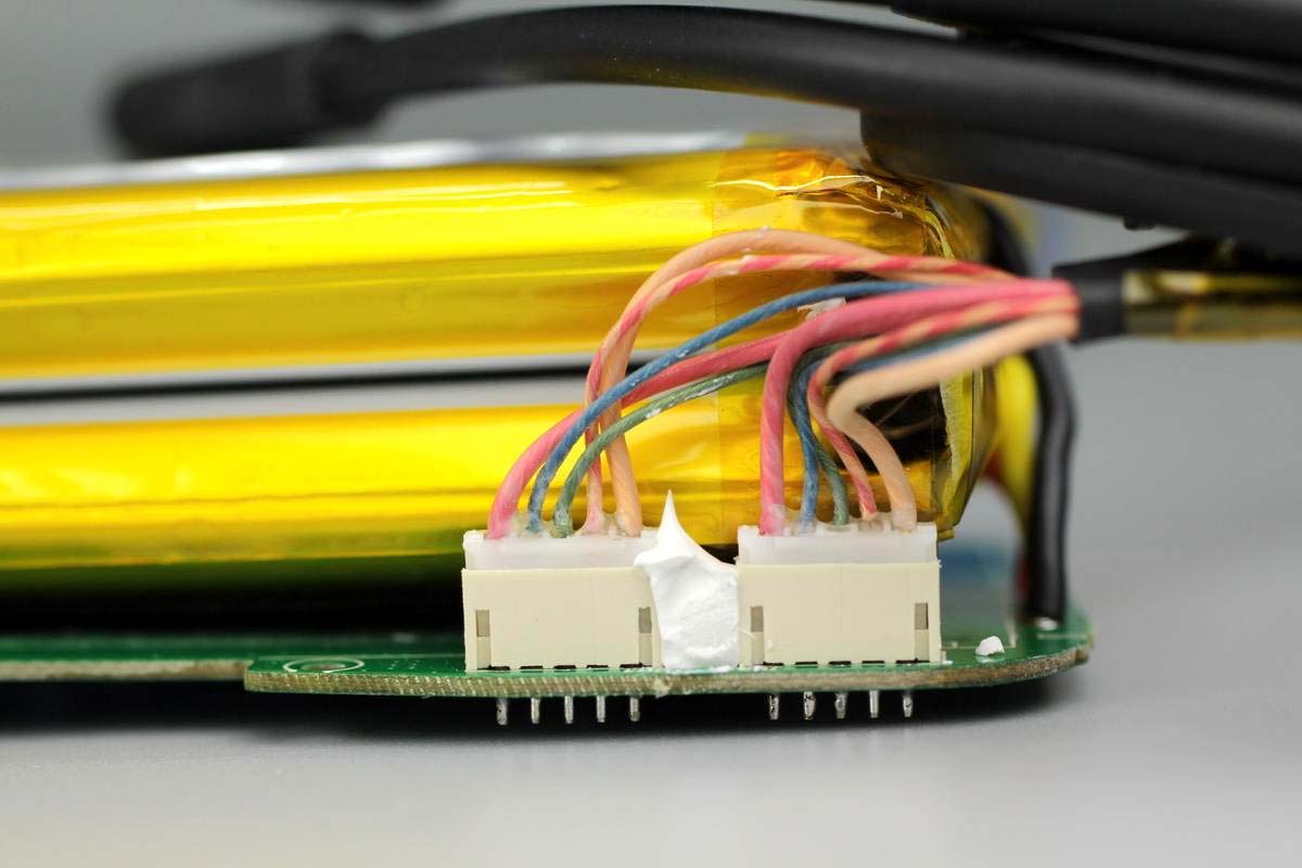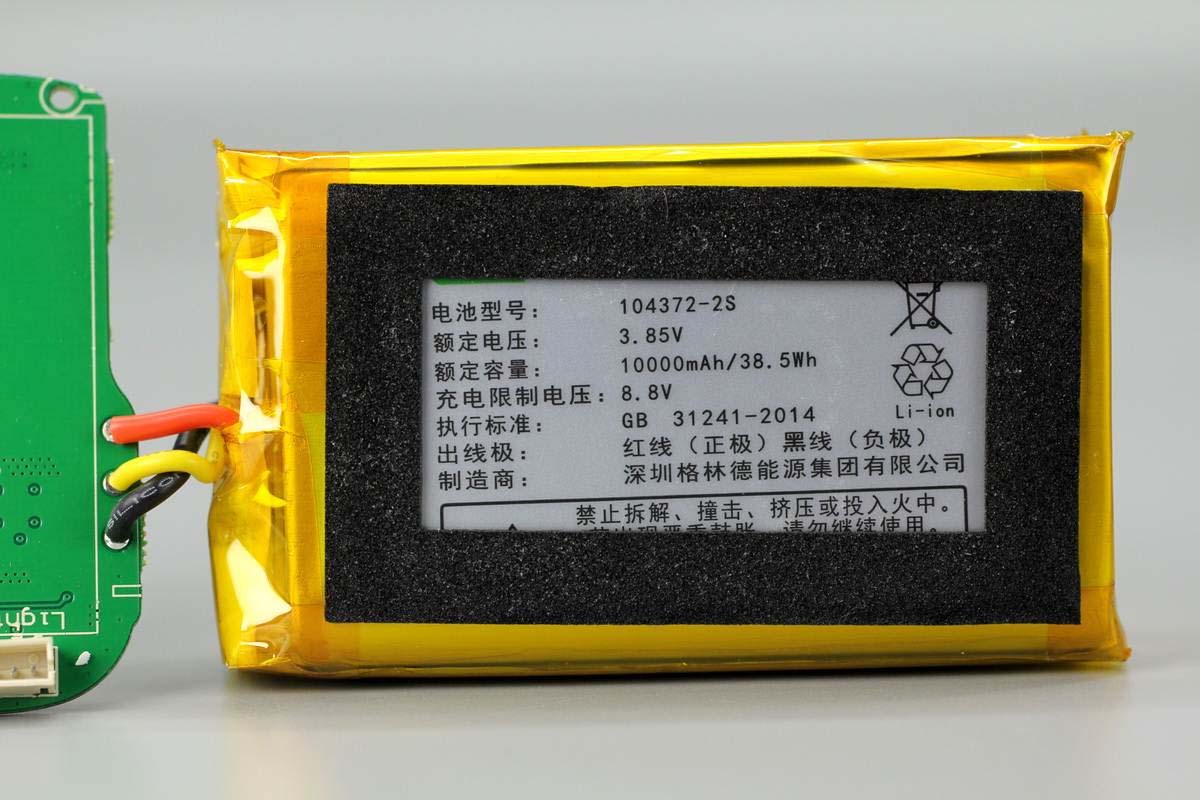電芯包裹絕緣膠帶,并貼有泡棉保護。電芯來自深圳格林德能源集團有限公司,額定電壓3.85V,額定容量10000mAh/38.5Wh,充電限制電壓8.8V,紅線為正極,黑線為負極。