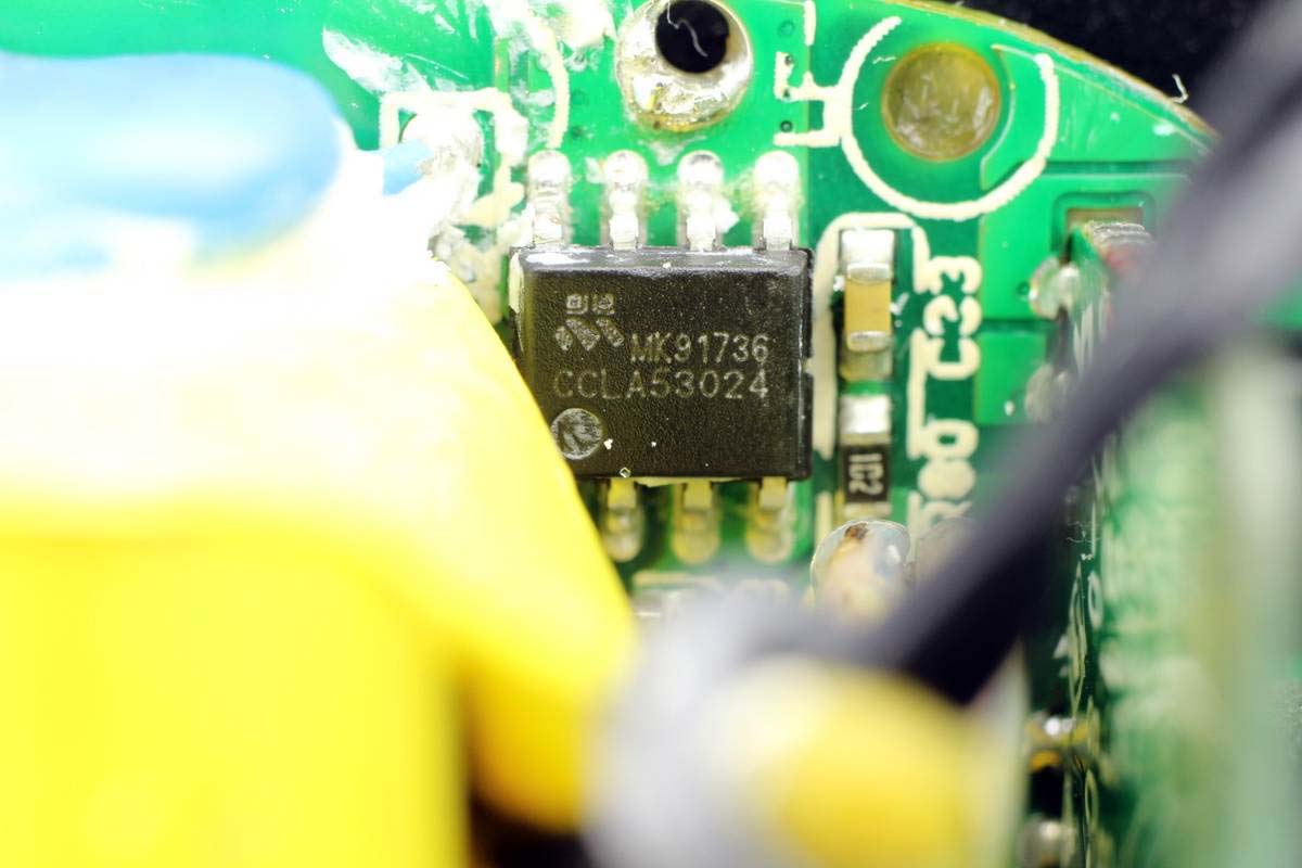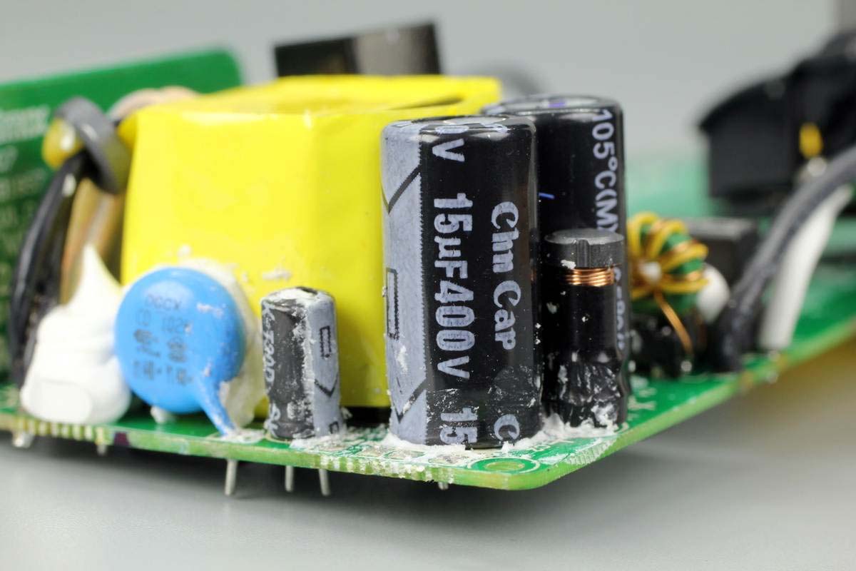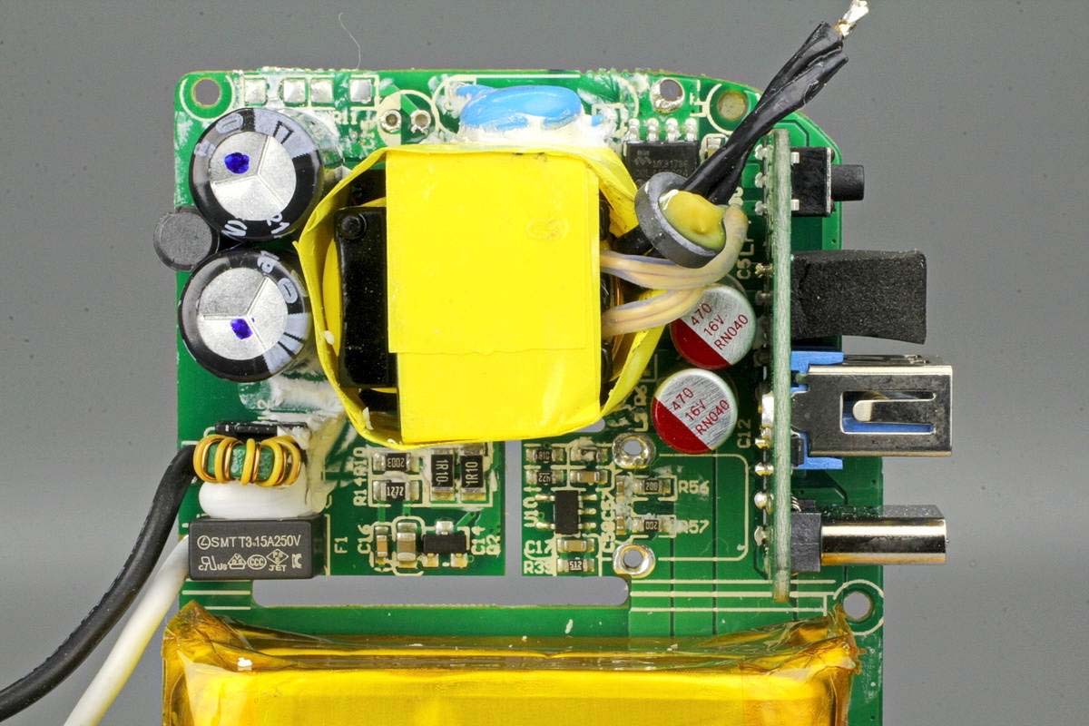 PCB板另一面,左端設有充電器的電容、變壓器等元器件。