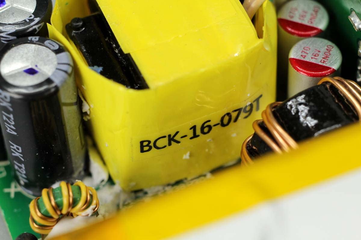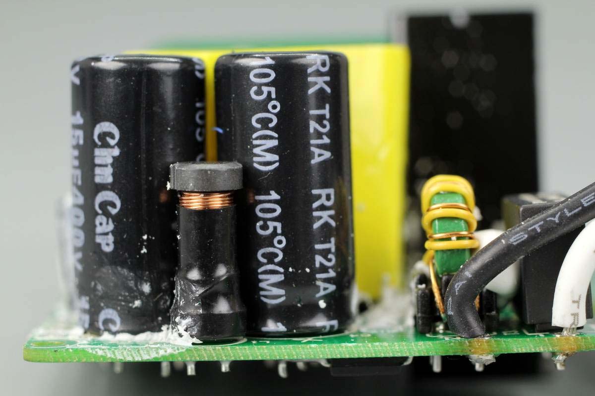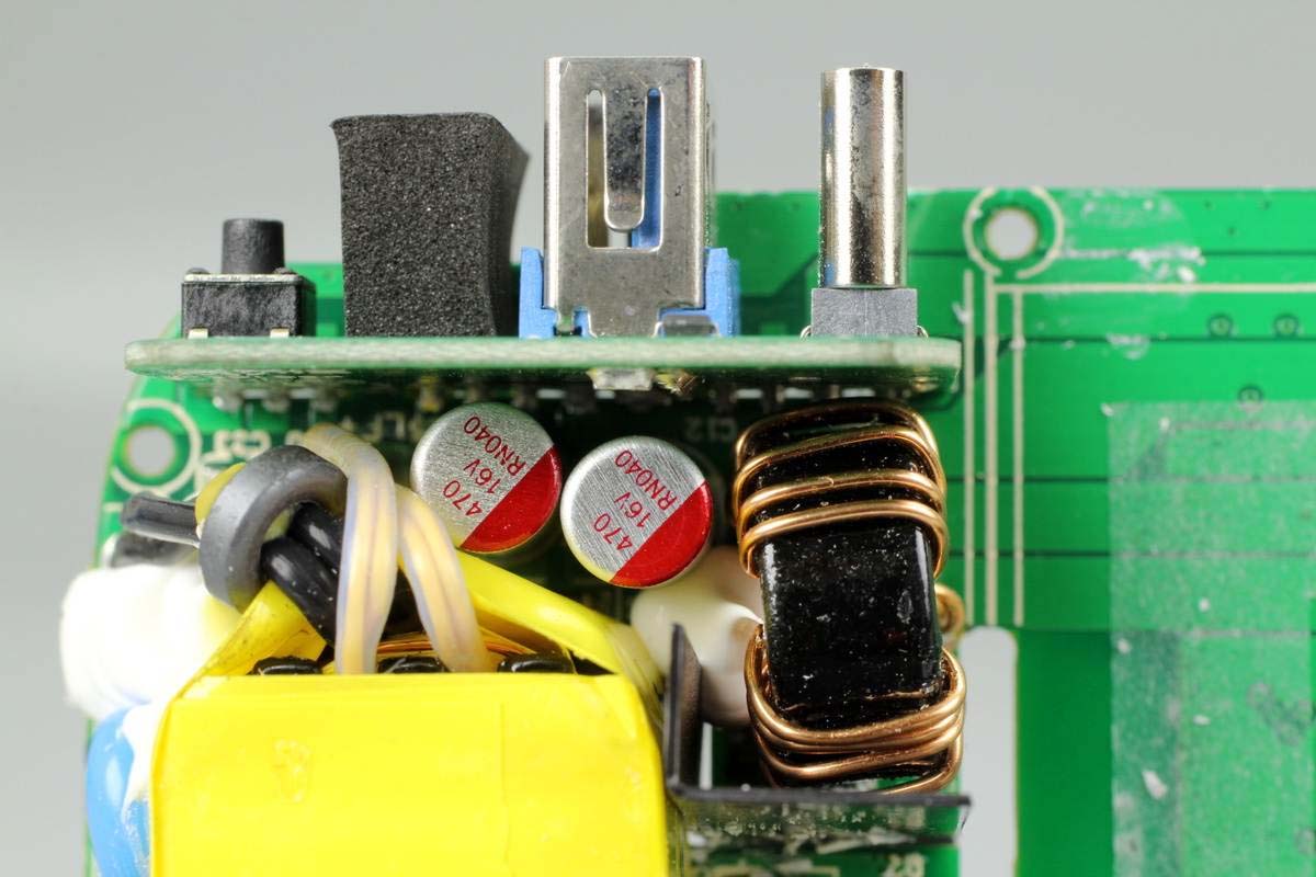 兩顆輸出濾波固態電容規格均為16V 470μF,右側還有一顆濾波電感。
