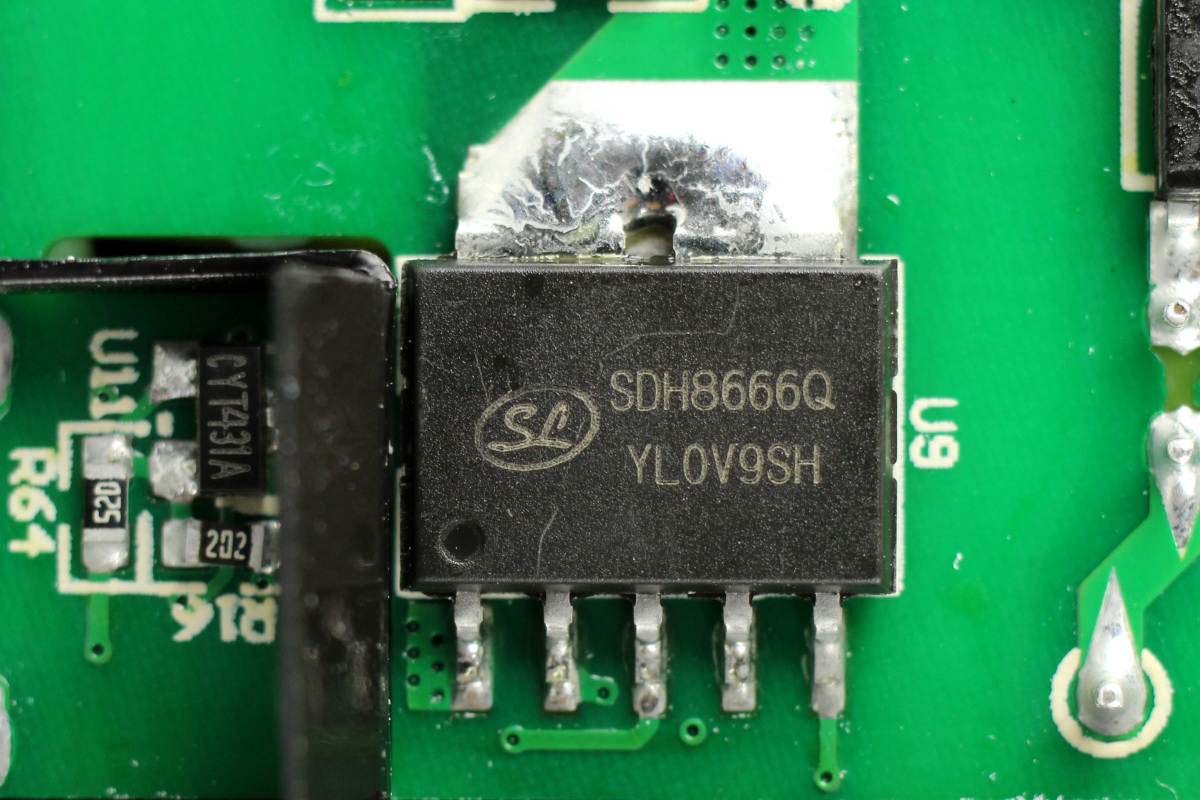 充電器主控芯片采用士蘭微SD8666QS。這是一款用于開關電源的內置高壓功率MOSFET、外置采樣電阻的準諧振電流模式PWM+PFM控制器。其支持多重模式控制,可有效減小開關損耗、提高轉換效率和降低待機功耗;支持抖頻功能改善EMI特性;支持全面完善的保護功能。