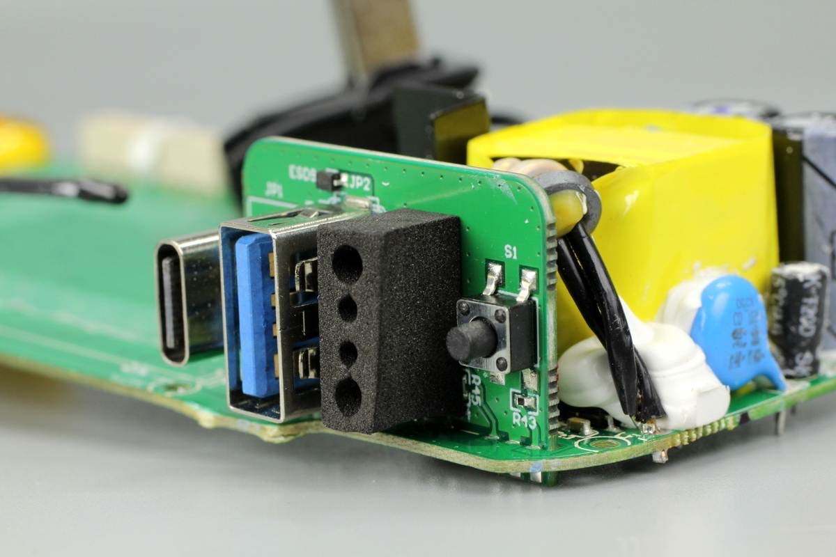 內部PCB板使用螺絲進行固定,左側是充電器電路,右側是移動電源電路,兩者間有隔離板進行隔離。