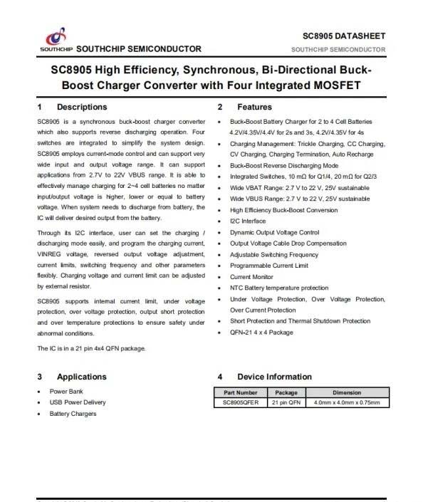 南芯SC8905是一顆雙向同步升降壓轉換器,內部集成了4顆低Rdson功率管,轉換效率超高以減少熱損耗,同時可以最大尺度減小外圍器件BOM,優化PCB空間及成本。該芯片使用電流控制模式,支持超寬的2.7V至22V電壓輸入,可有效管理2節至4節電池的充電;當系統需要從電池獲取能量時,可實現電池反向放電功能。